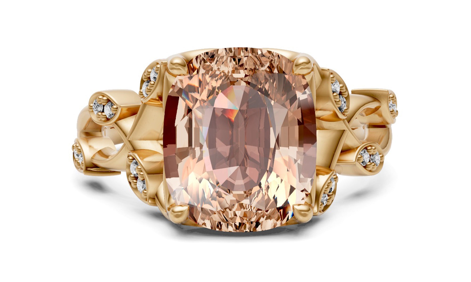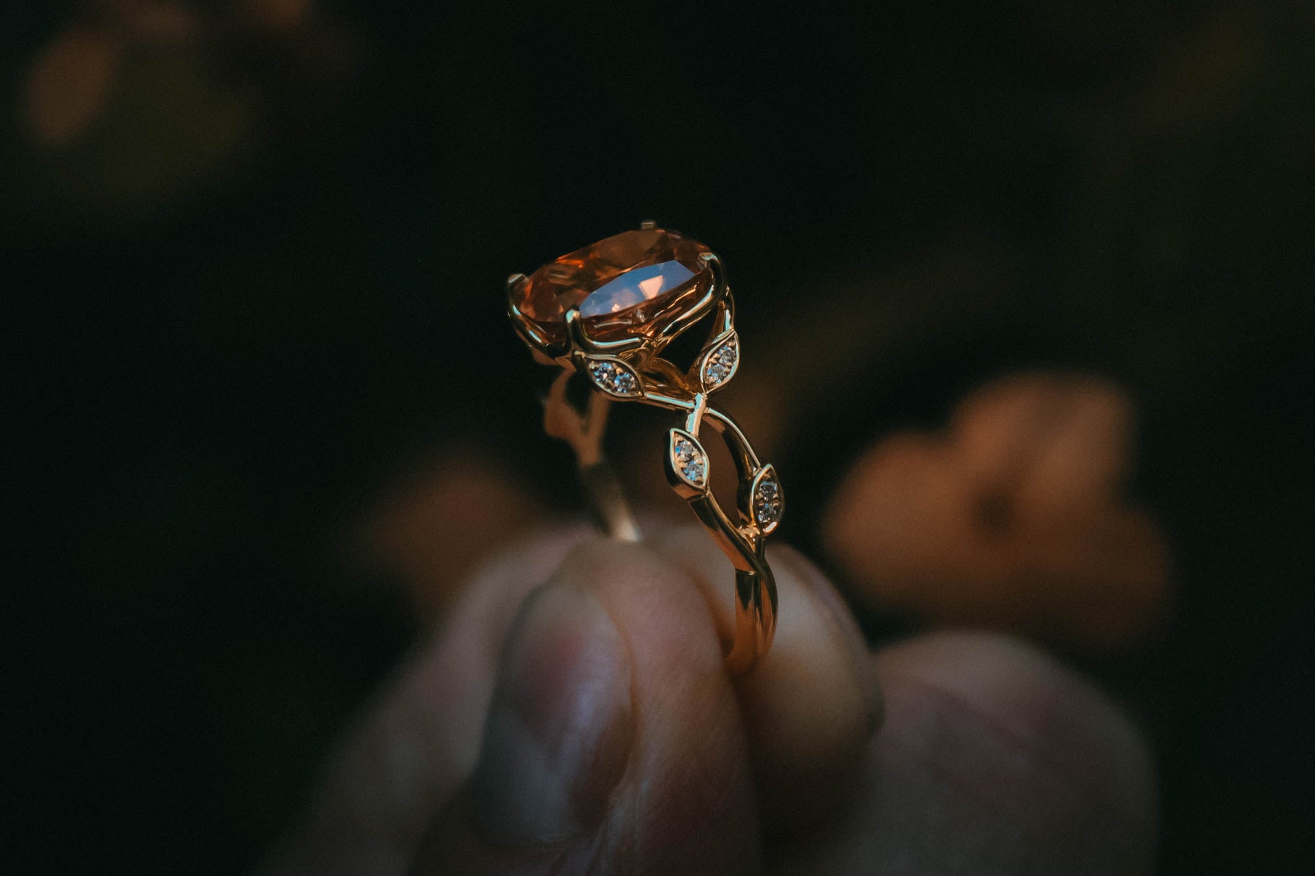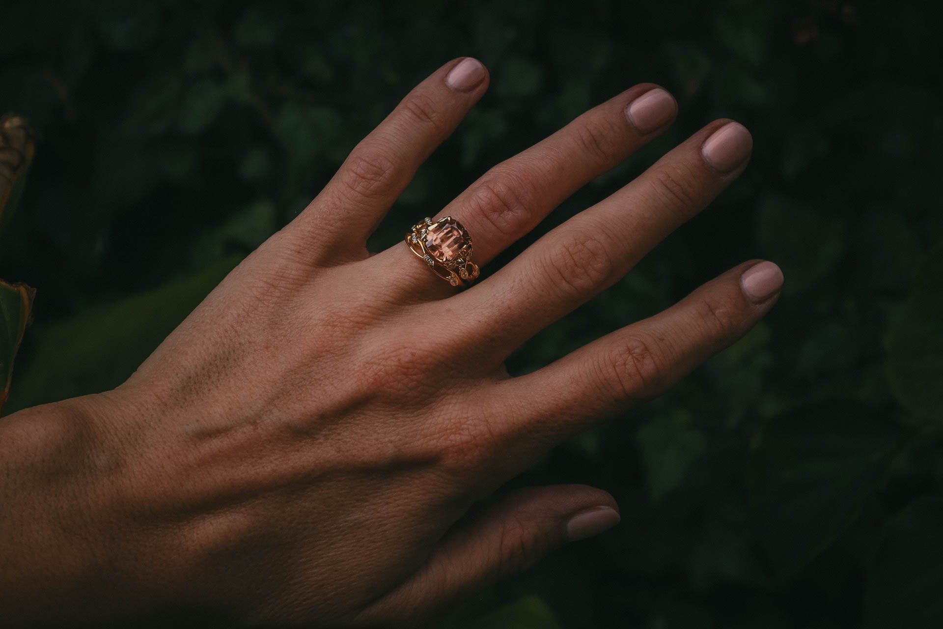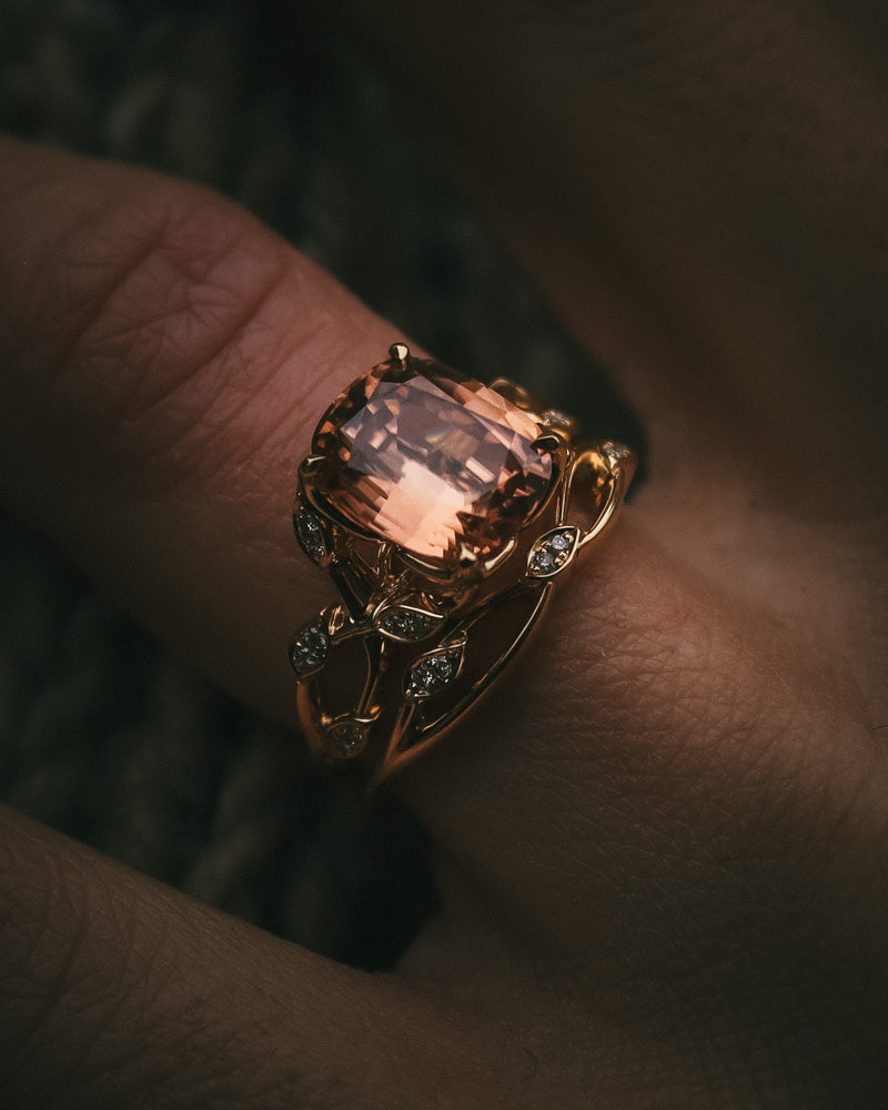The Feàrn ring is centred around an unusual peach zircon from Tanzania, responsibly sourced through Moyo Gems*. Untreated and completely natural, it displays warm peachy-bronze tones and a lively sparkle.