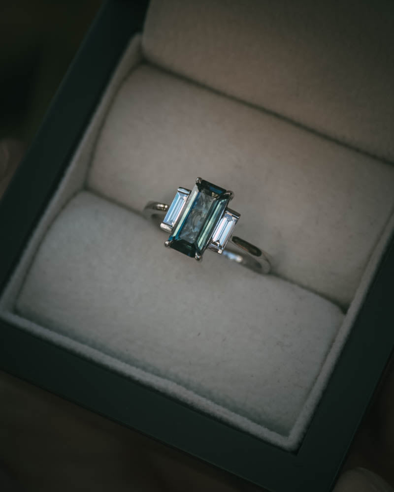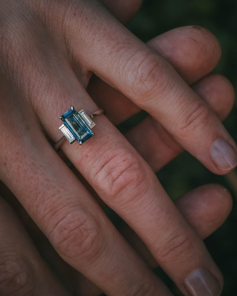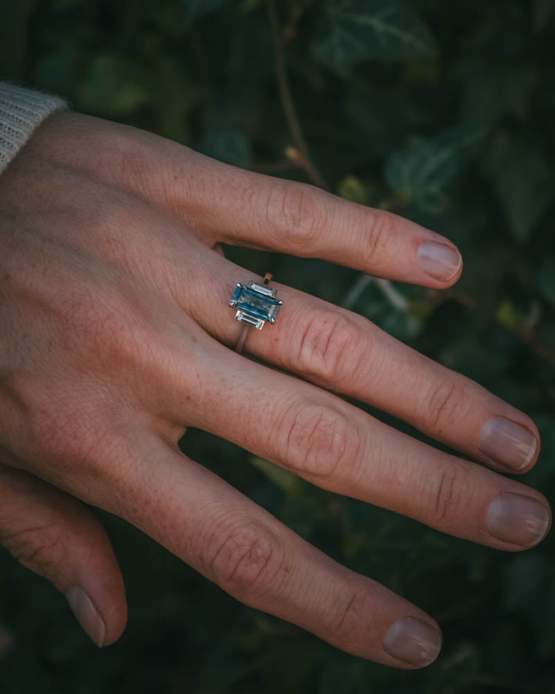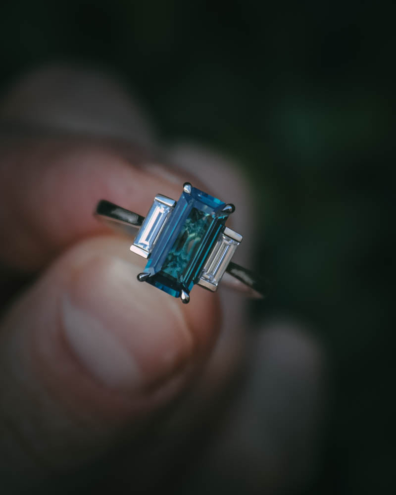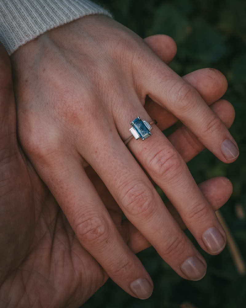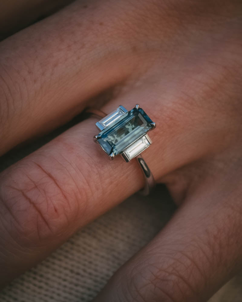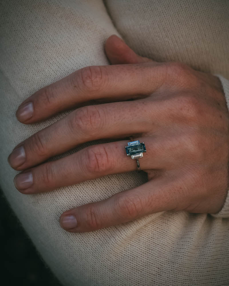 The Dàna ring is bold, structured, and quietly glamorous – a design with echoes of a bygone era. The gorgeous emerald-cut teal sapphire brings clarity and depth, while the clean lines of baguette-cut diamonds on either side adds balance and a distinctive modern Art Deco feel.