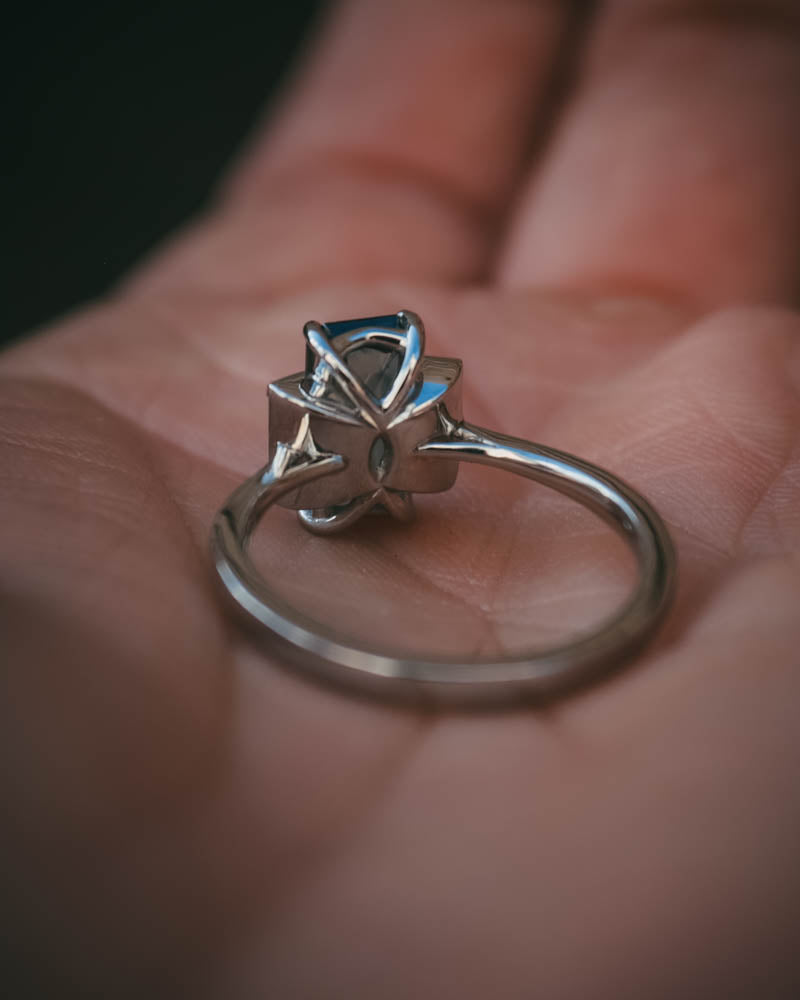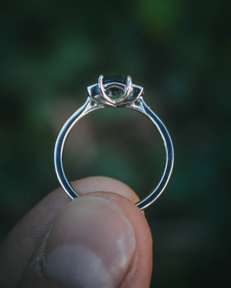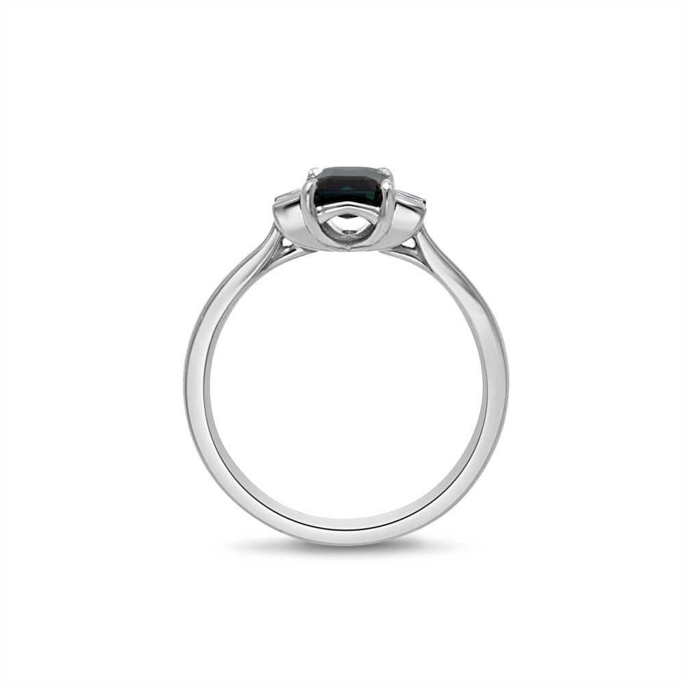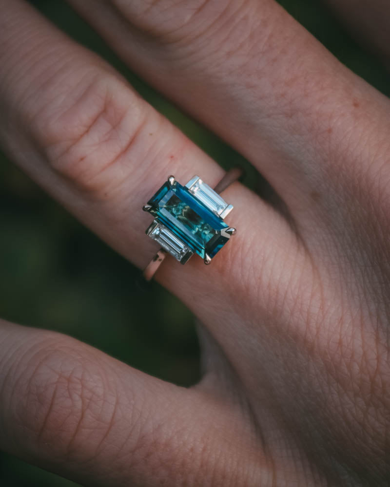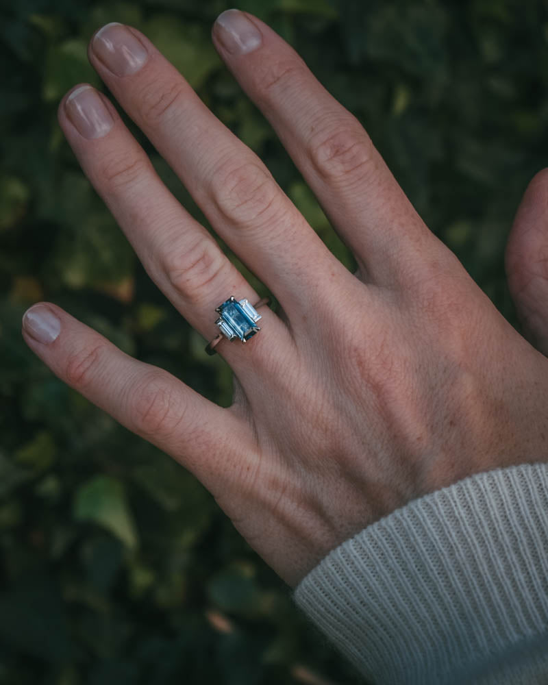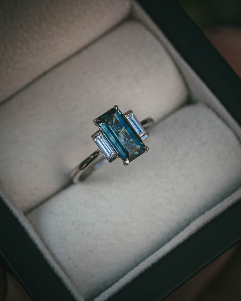 The Dàna ring is bold, structured, and quietly glamorous – a design with echoes of a bygone era. The gorgeous emerald-cut teal sapphire brings clarity and depth, while the clean lines of baguette-cut diamonds on either side adds balance and a distinctive modern Art Deco feel.