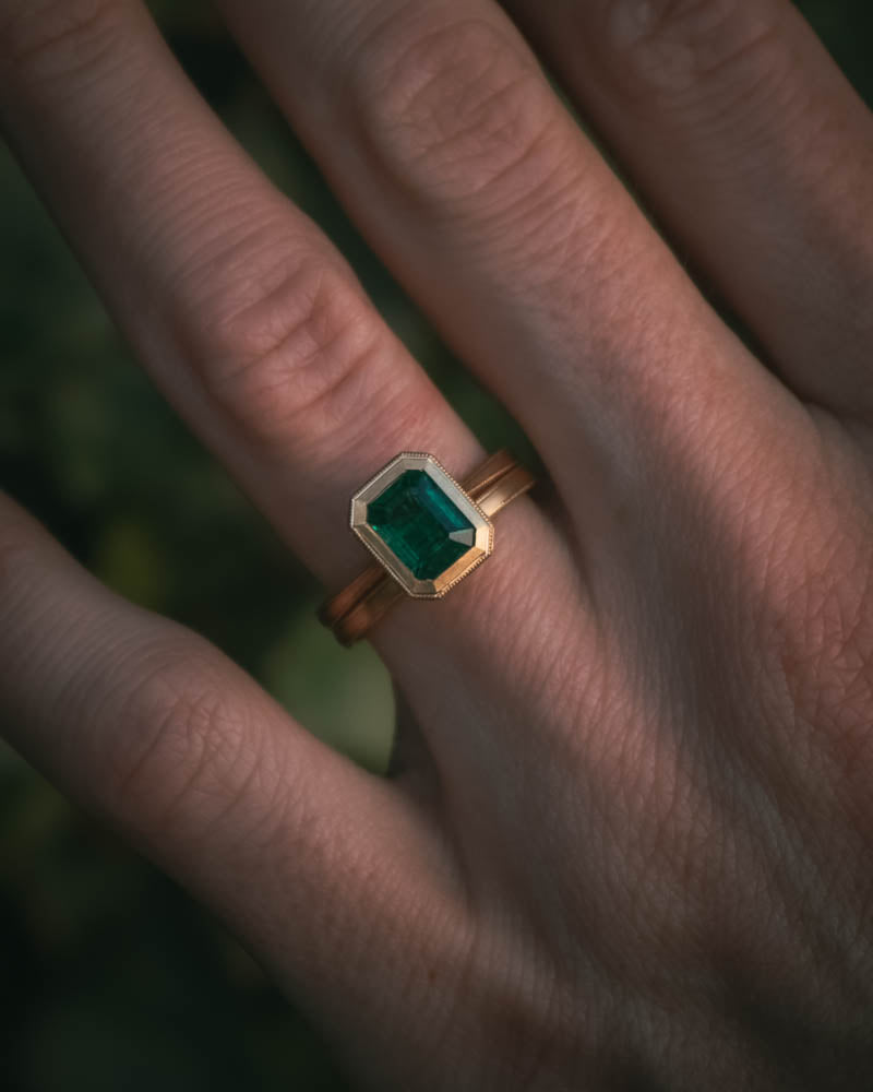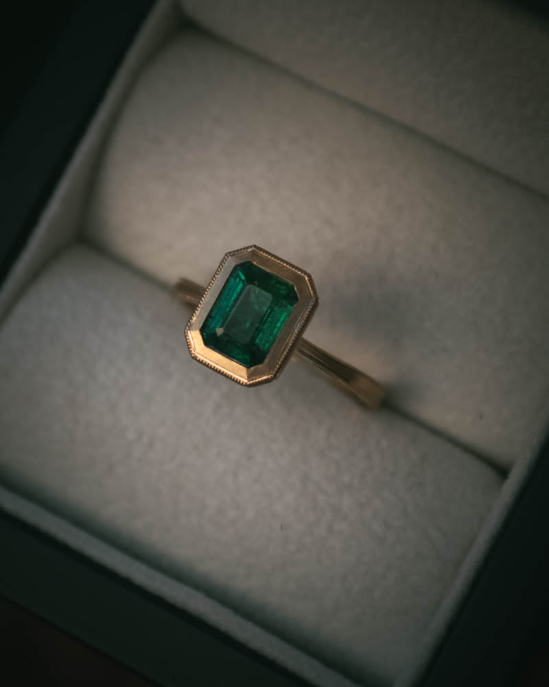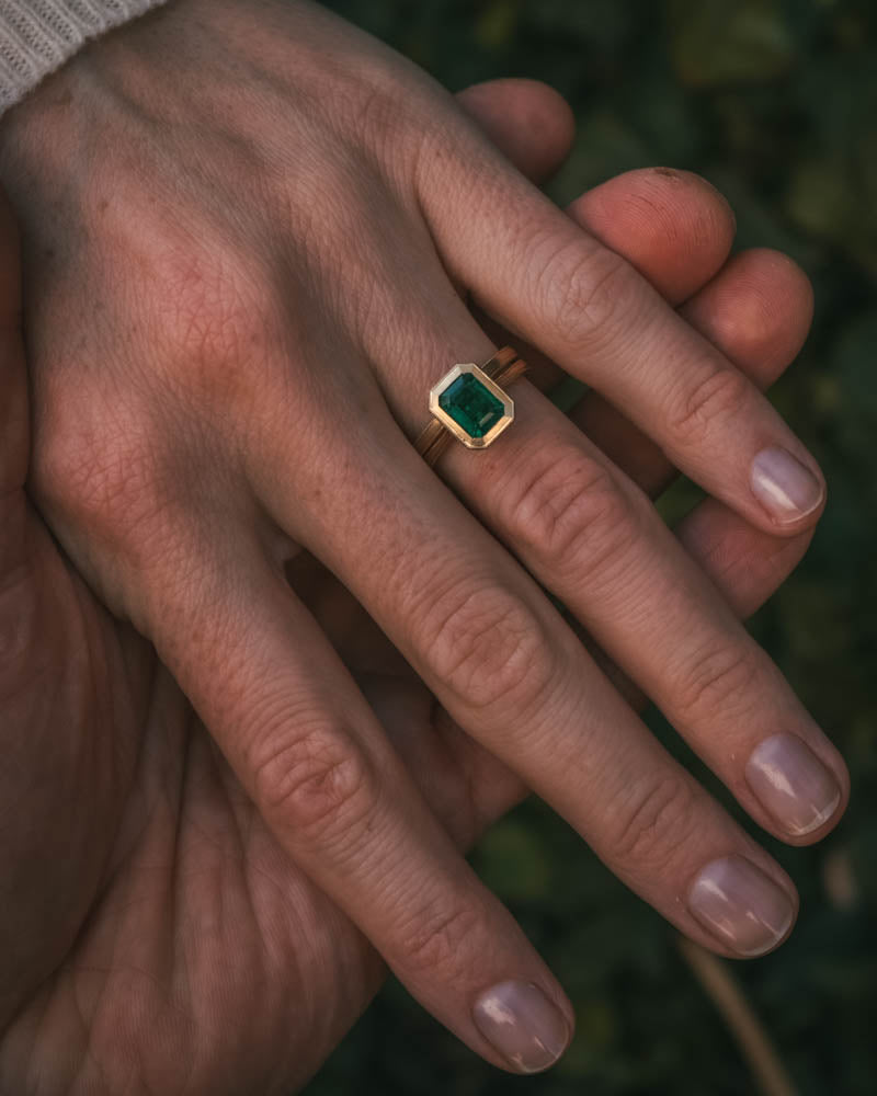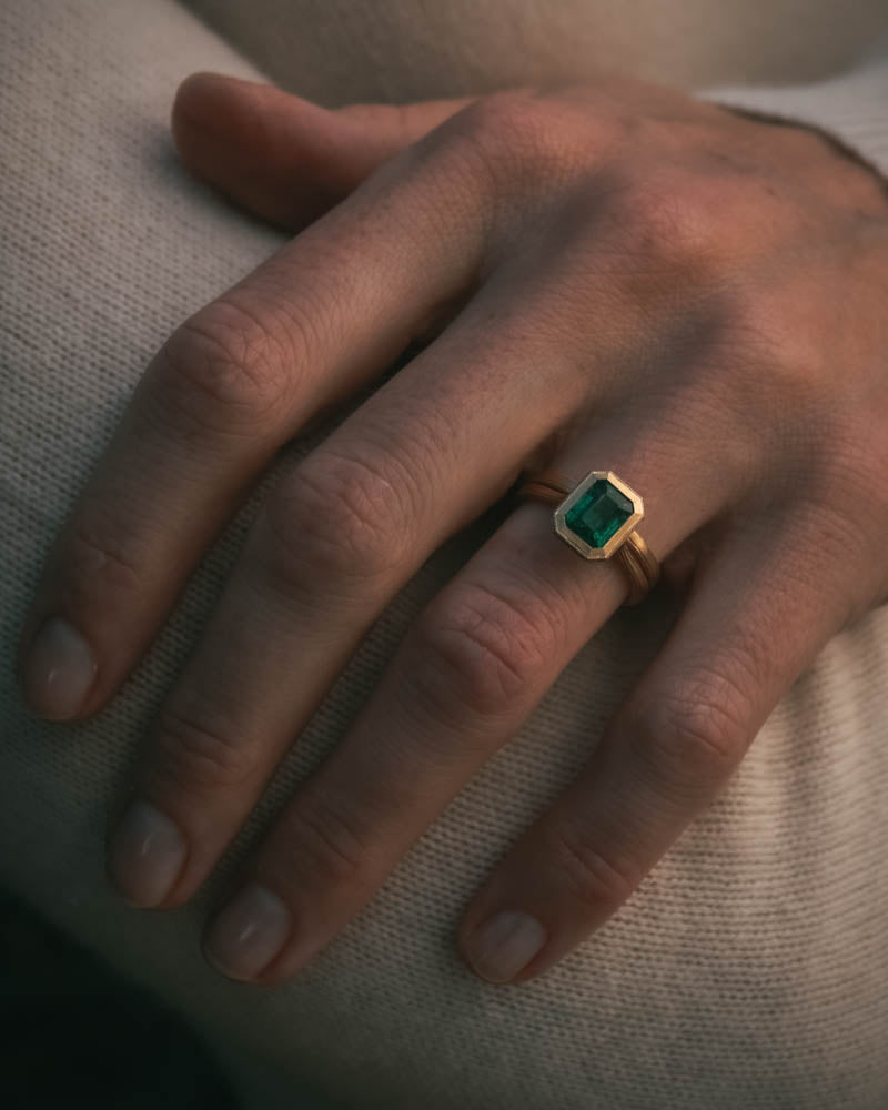 Inspired by nature and crafted with quiet confidence, the Lòrien ring features a striking 1.45ct natural Madagascan emerald in a classic emerald cut. The rich green stone is set in a smooth 18K yellow gold rubover setting – offering a minimal, refined look while providing gentle protection for the gemstone.