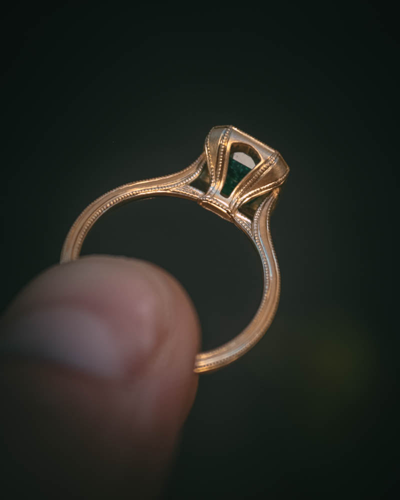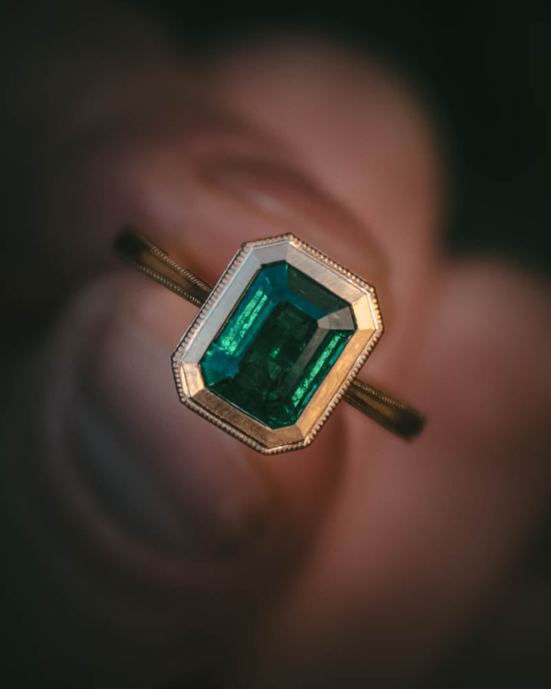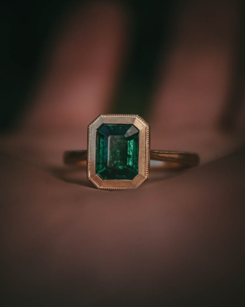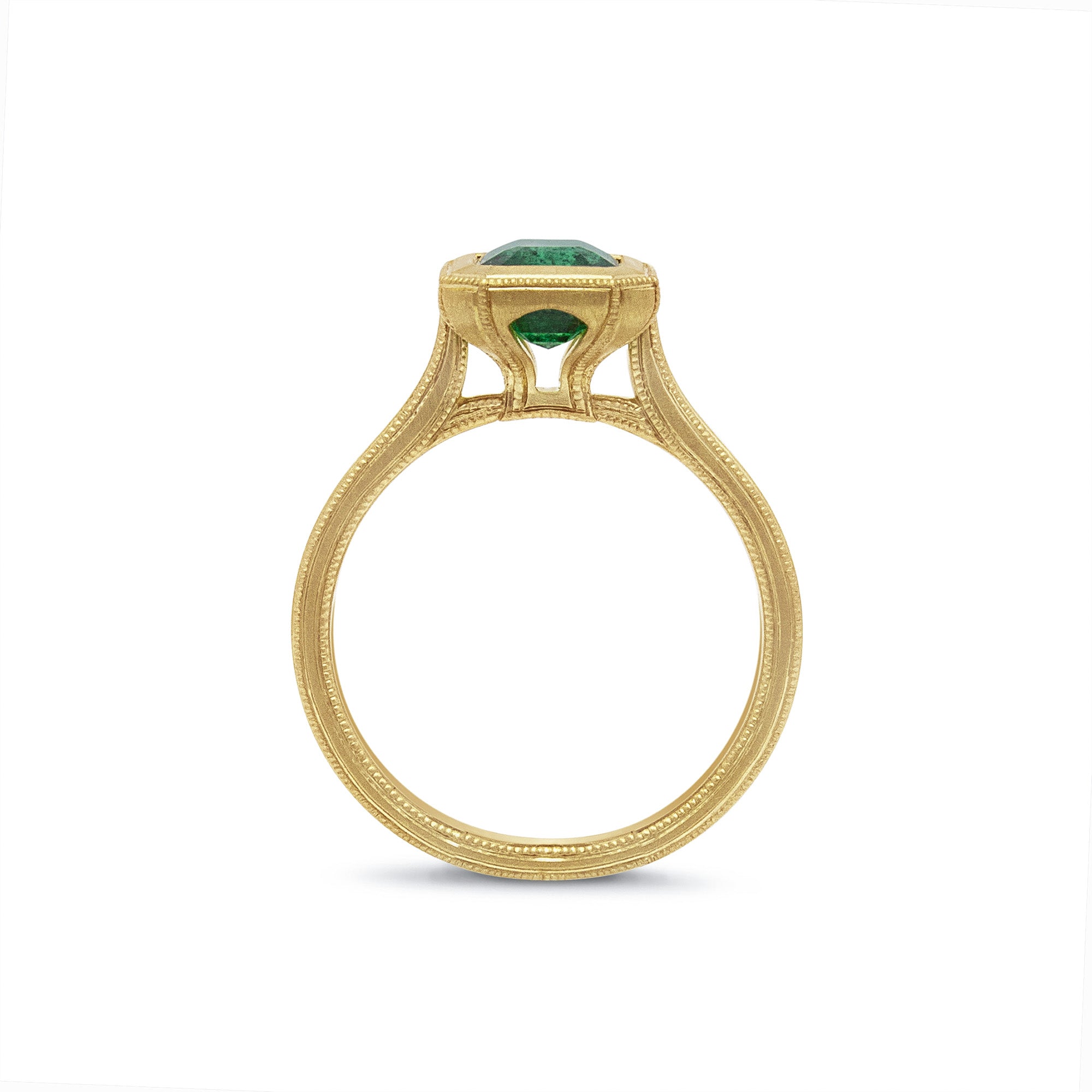 Inspired by nature and crafted with quiet confidence, the Lòrien ring features a striking 1.45ct natural Madagascan emerald in a classic emerald cut. The rich green stone is set in a smooth 18K yellow gold rubover setting – offering a minimal, refined look while providing gentle protection for the gemstone.
