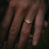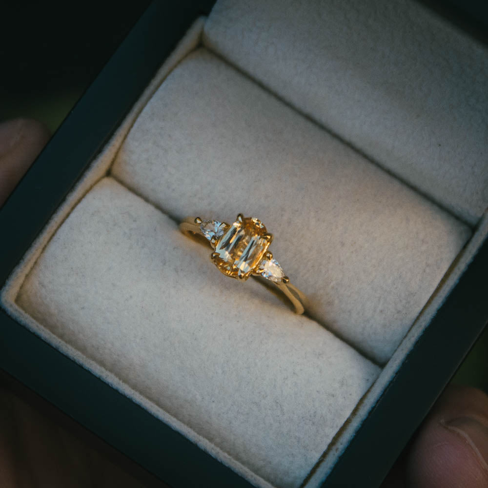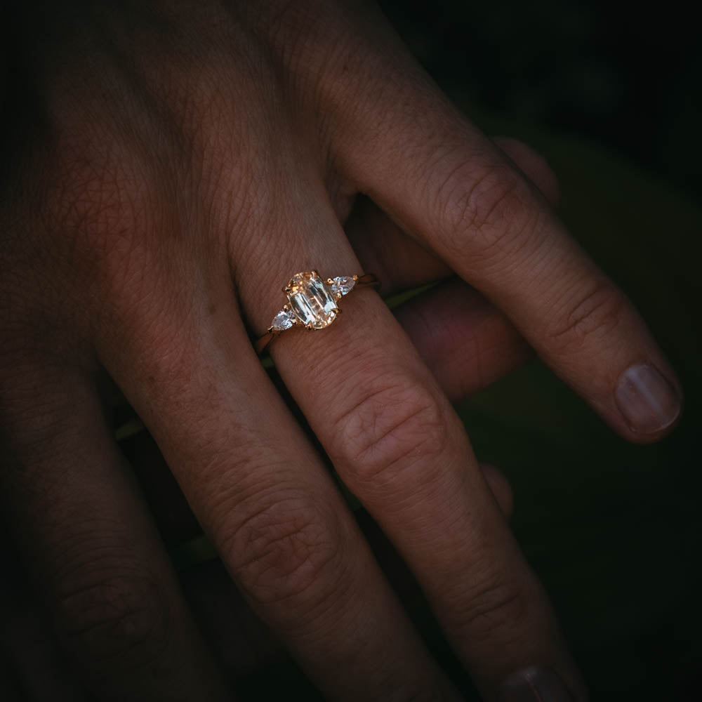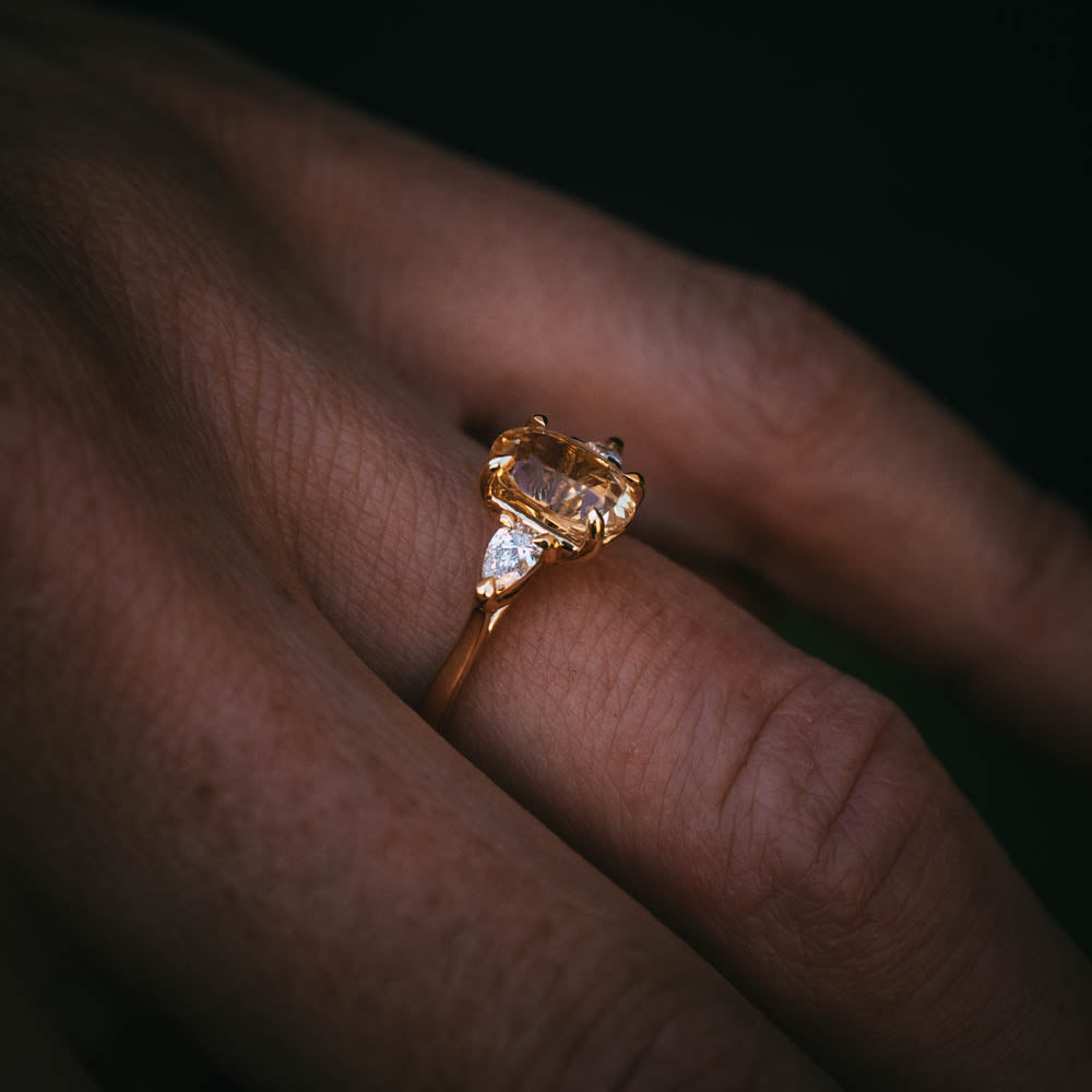 Our Gigha engagement ring features Moira's signature style Petal setting with pear-shaped diamond accents leading your eye up to a gorgeous oval peach sapphire. This style is ‘wedfit’ so it’s designed to sit nice and flush alongside a wedding band.