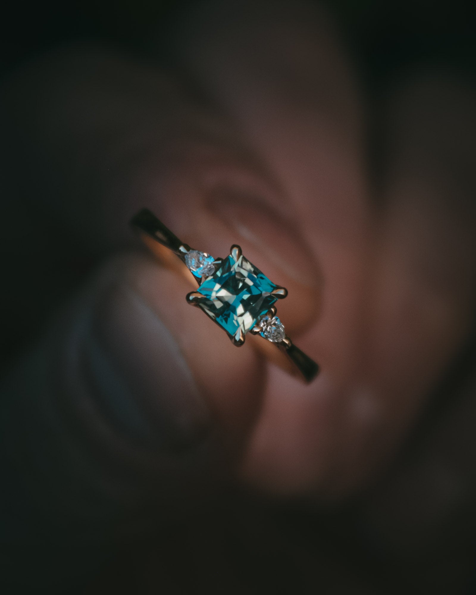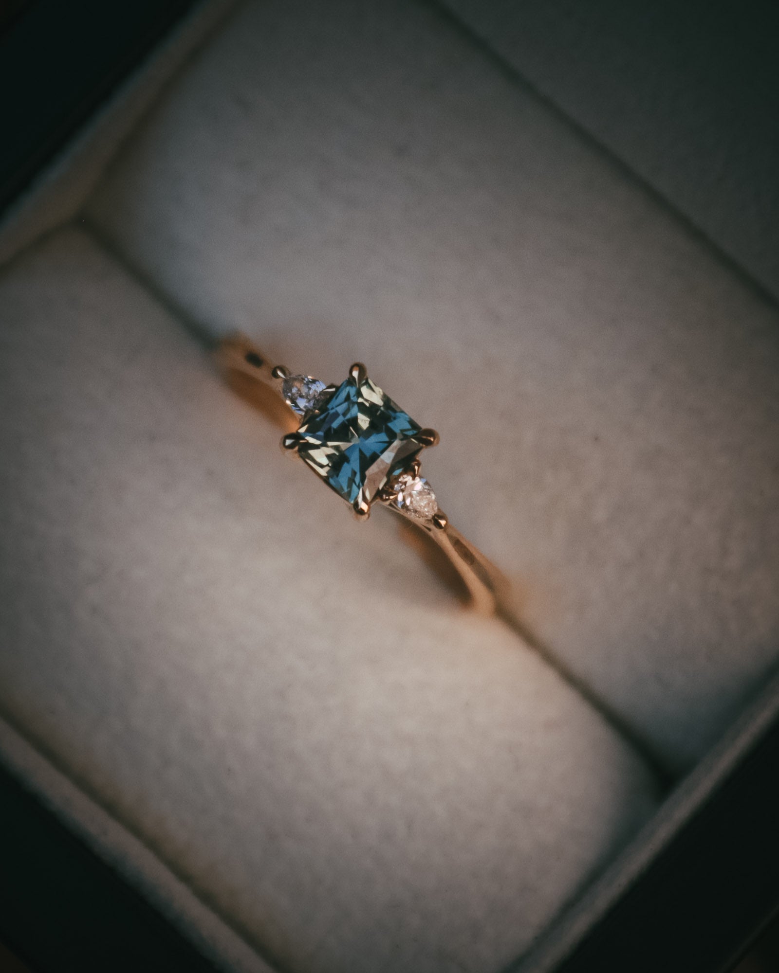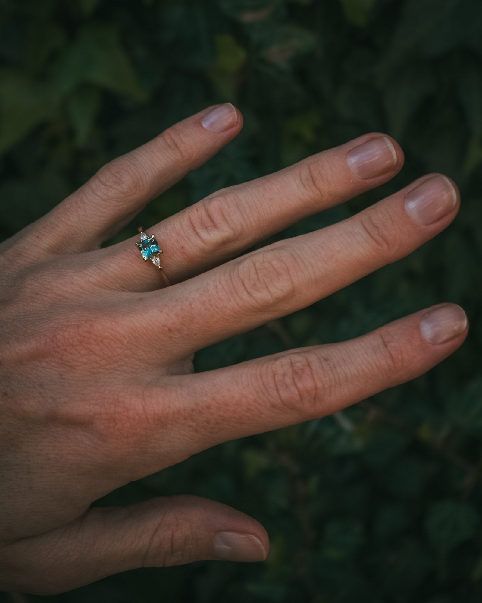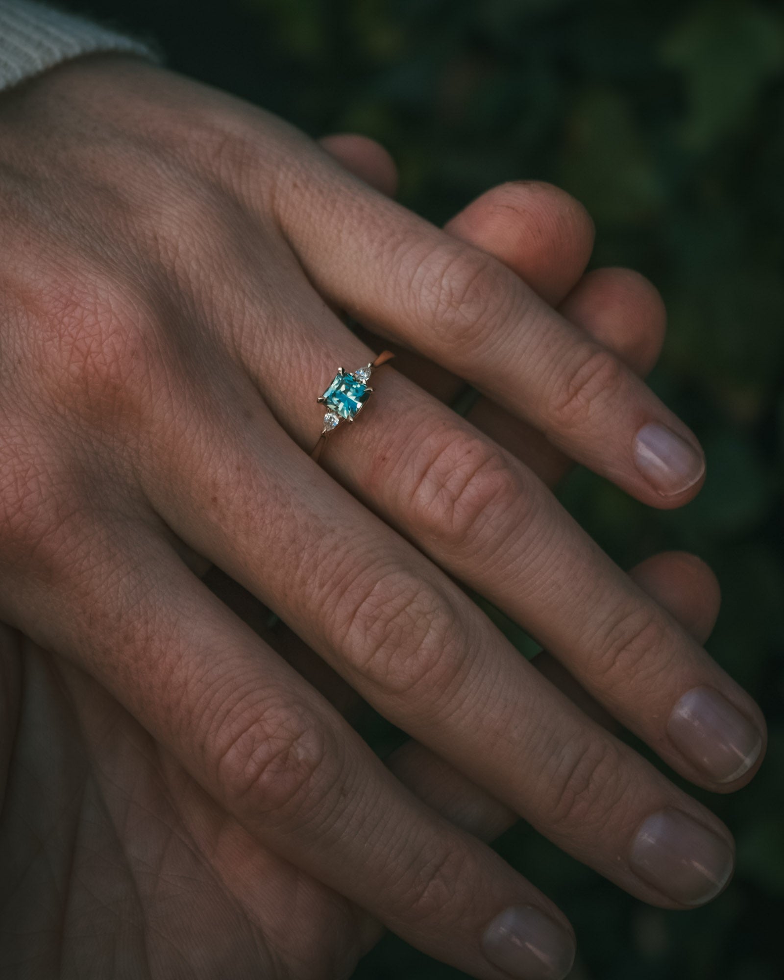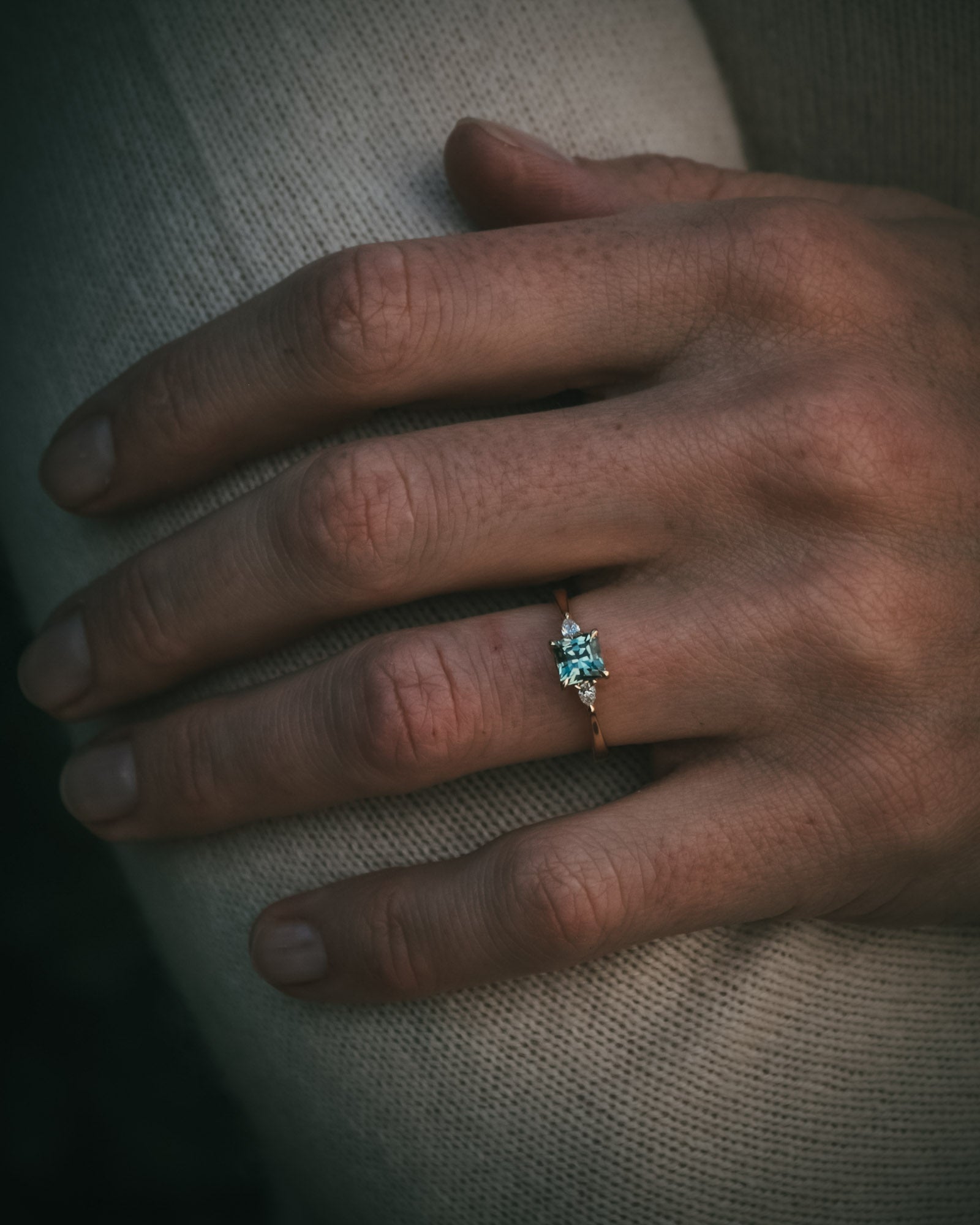 The Luin ring features a rare green Montana sapphire at its centre. Cut in an octagon scissor cut, the stone displays clean geometry with flashes of green that shift gently in different lights - elegant, distinctive, and full of character.