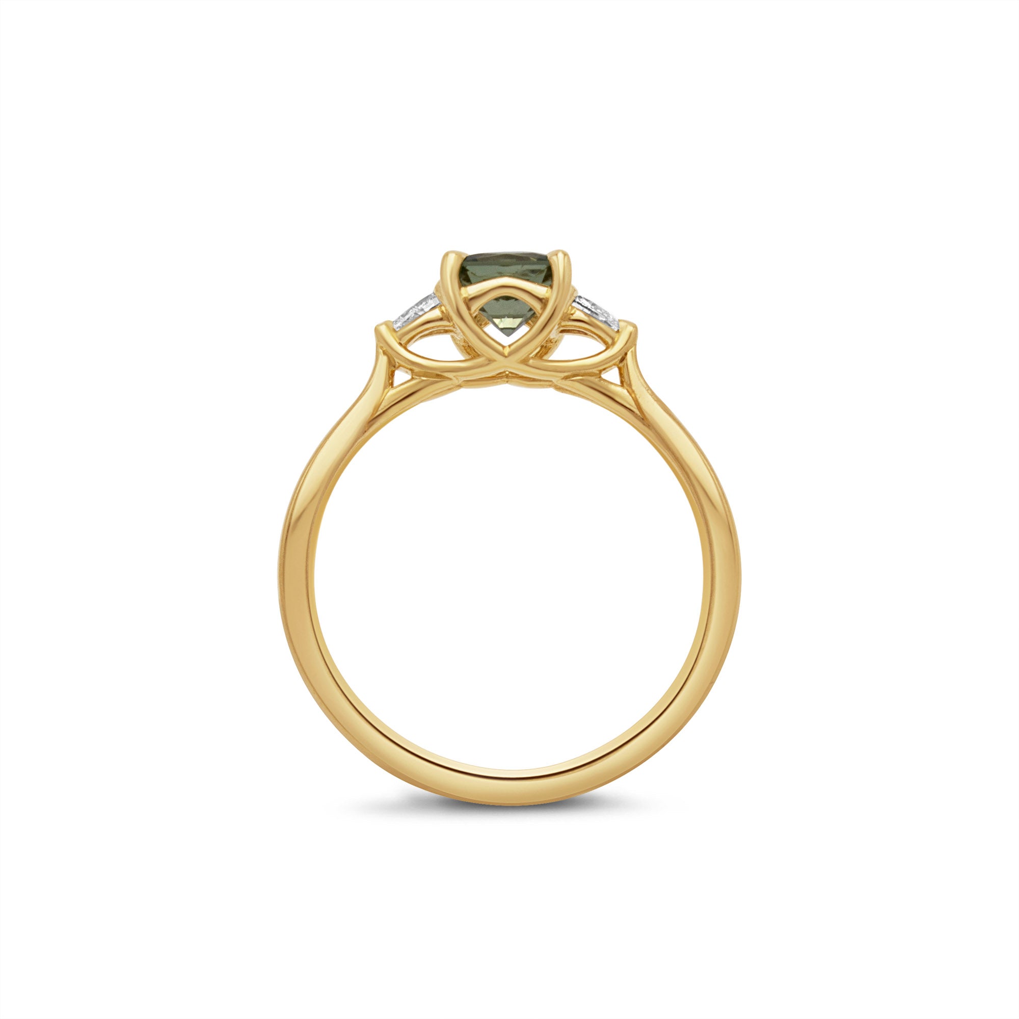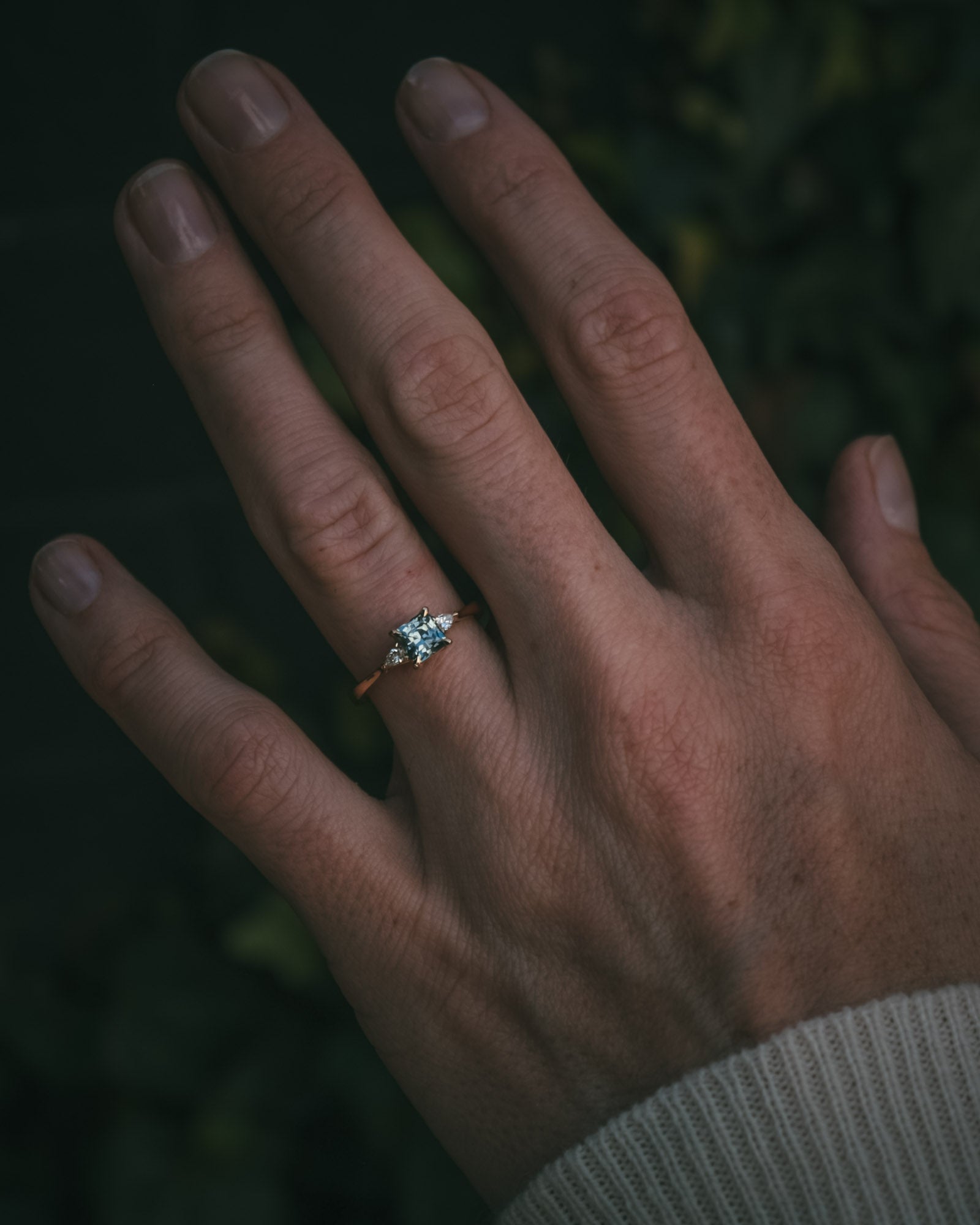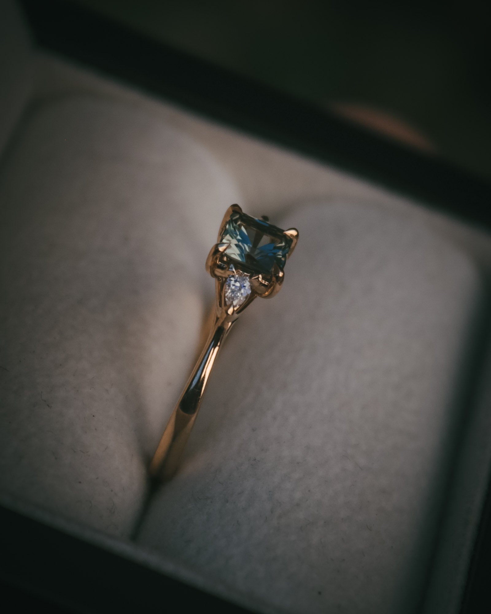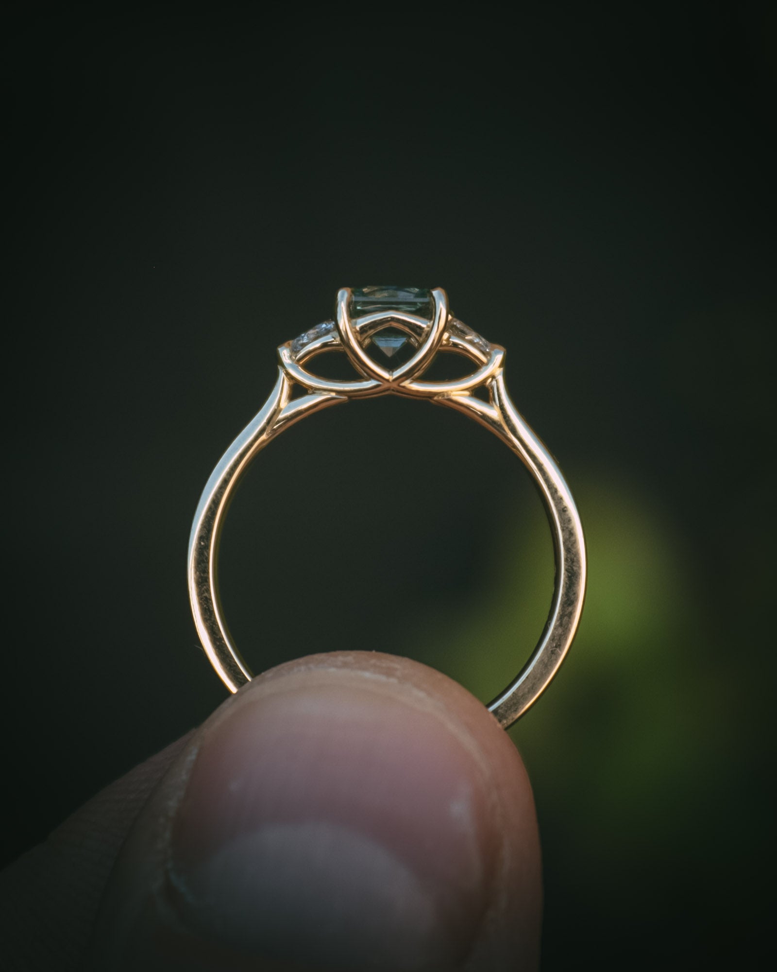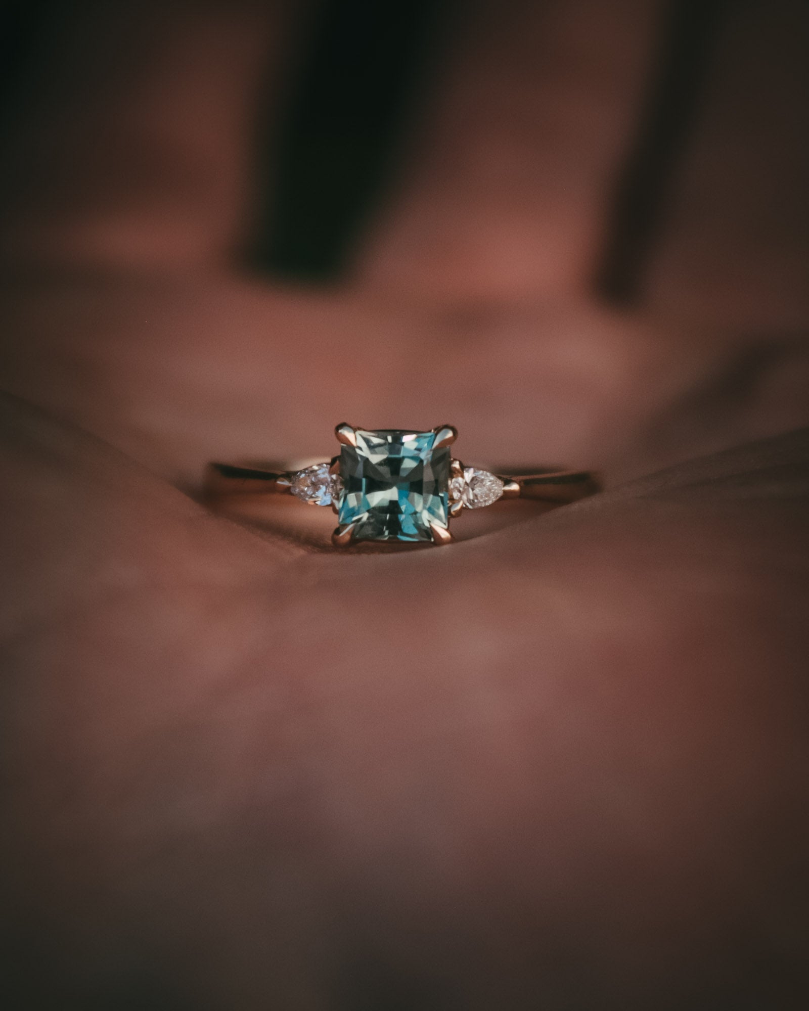 The Luin ring features a rare green Montana sapphire at its centre. Cut in an octagon scissor cut, the stone displays clean geometry with flashes of green that shift gently in different lights - elegant, distinctive, and full of character.