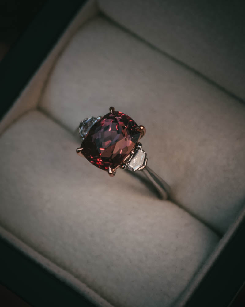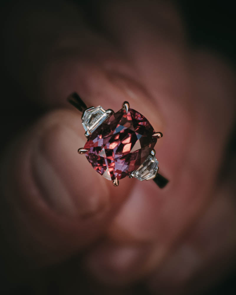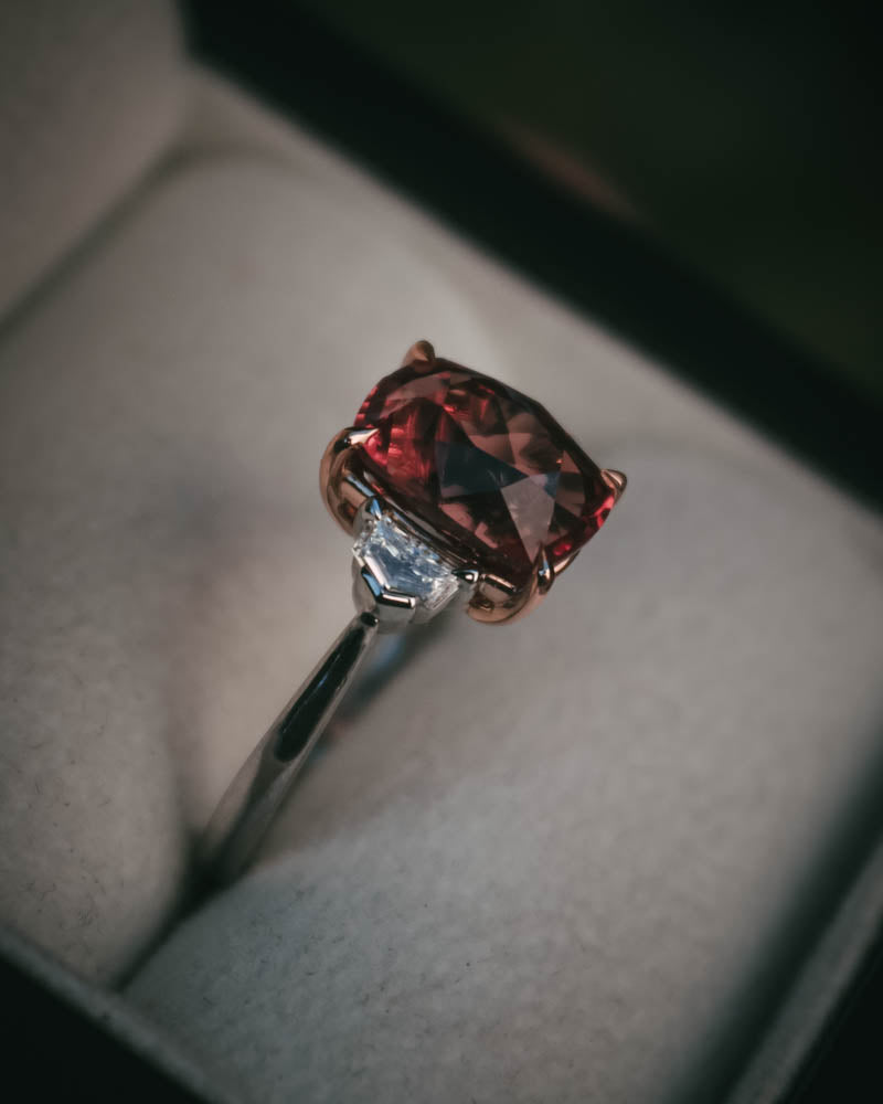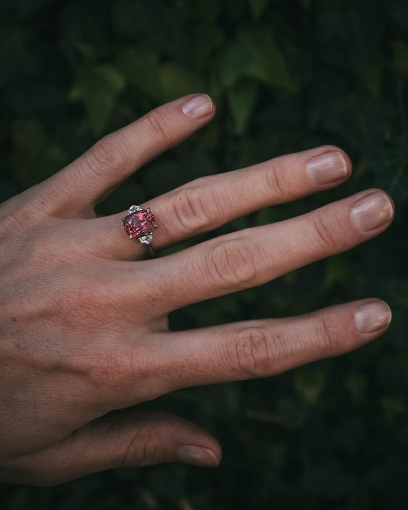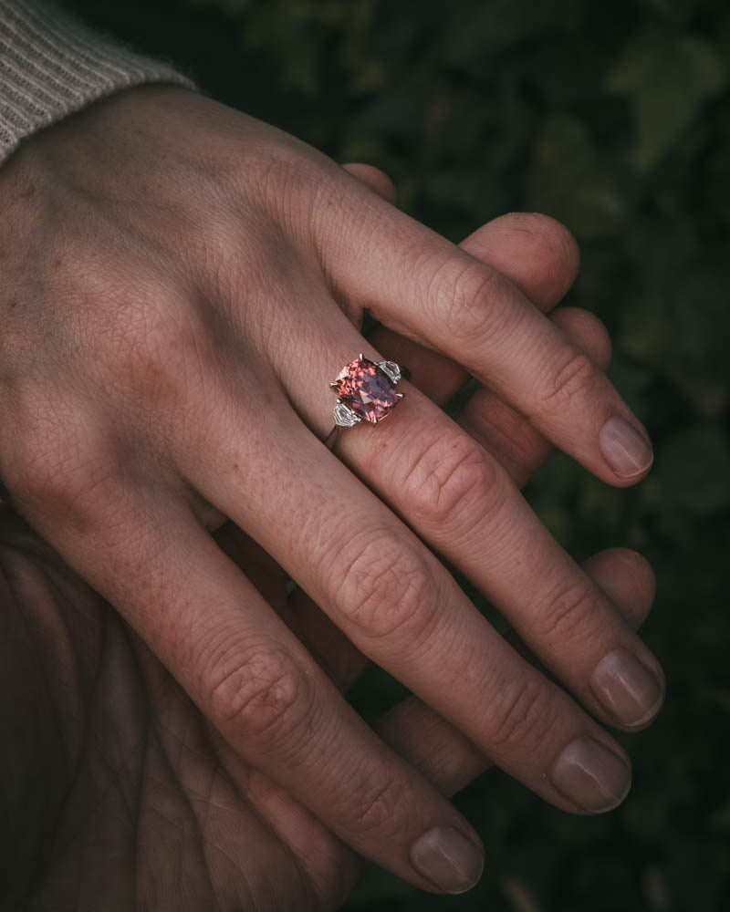 The Ròs ring features an extraordinary cushion-cut Malaya garnet, sourced from Bekily, Madagascar. Malaya (or Malaia) garnets are known for their unique colouring – a natural blend of luscious deep red to peachy pink tones and are found in only a handful of locations worldwide.