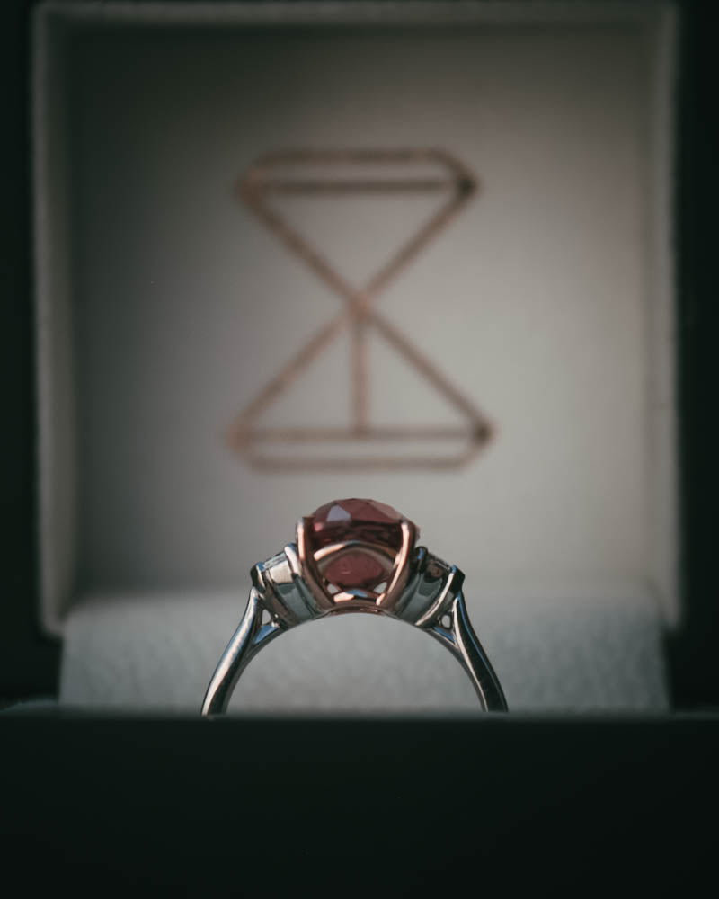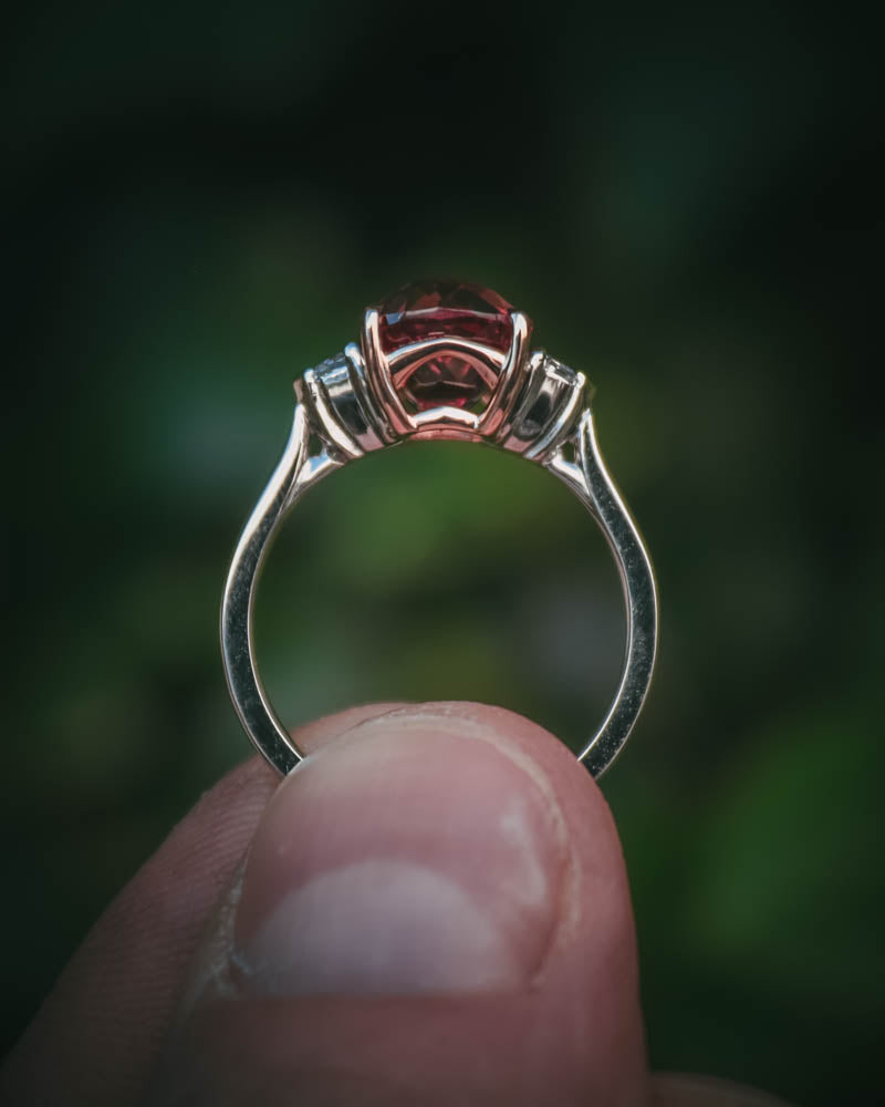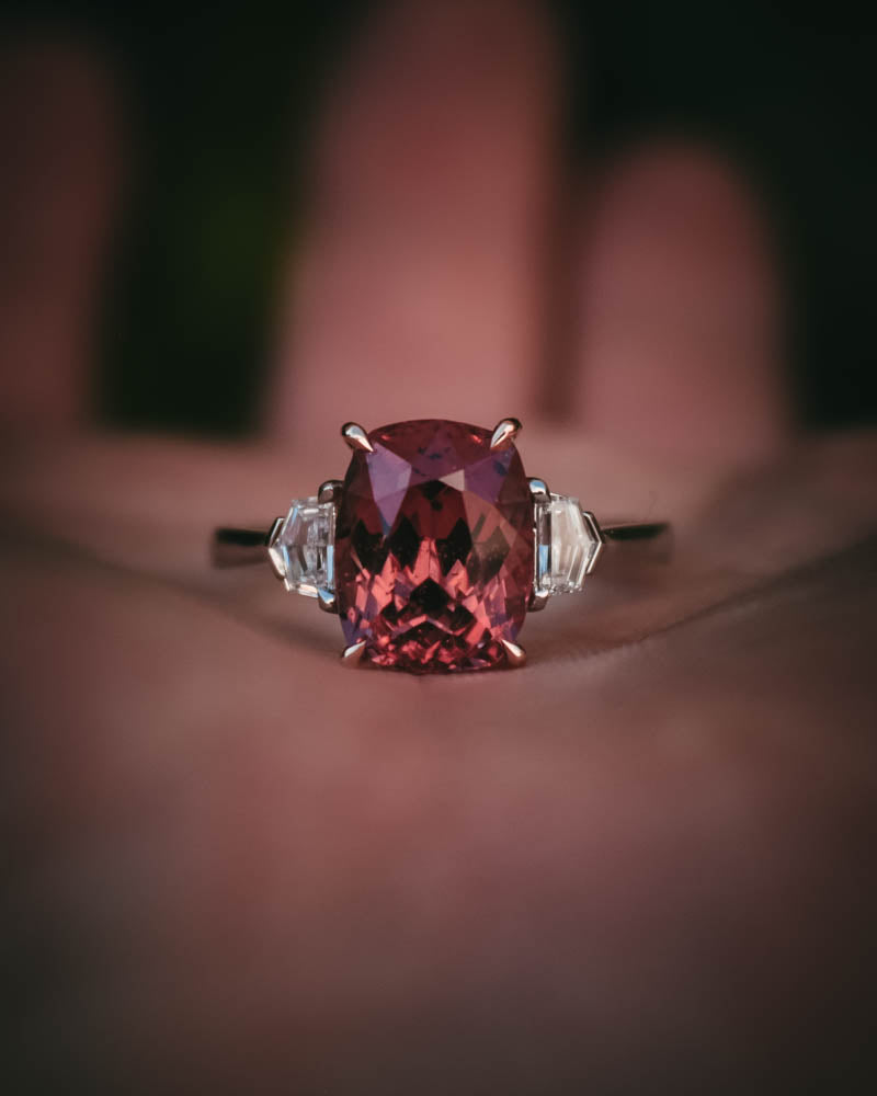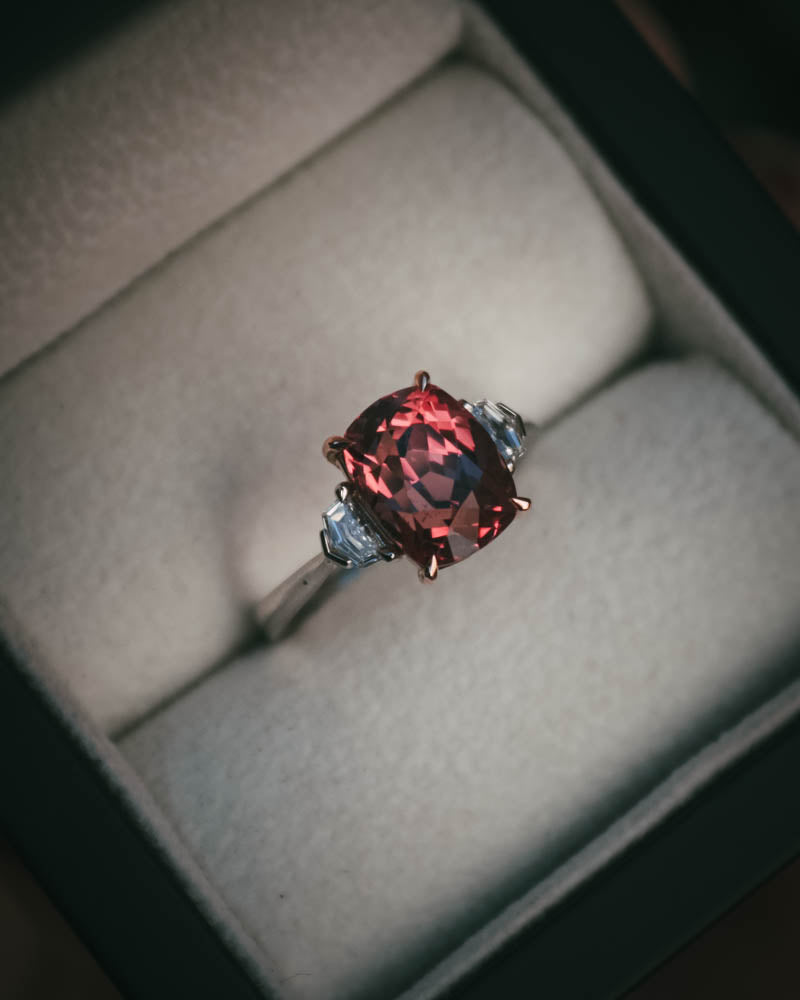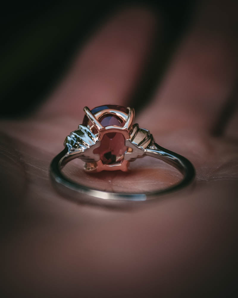 The Ròs ring features an extraordinary cushion-cut Malaya garnet, sourced from Bekily, Madagascar. Malaya (or Malaia) garnets are known for their unique colouring – a natural blend of luscious deep red to peachy pink tones and are found in only a handful of locations worldwide.