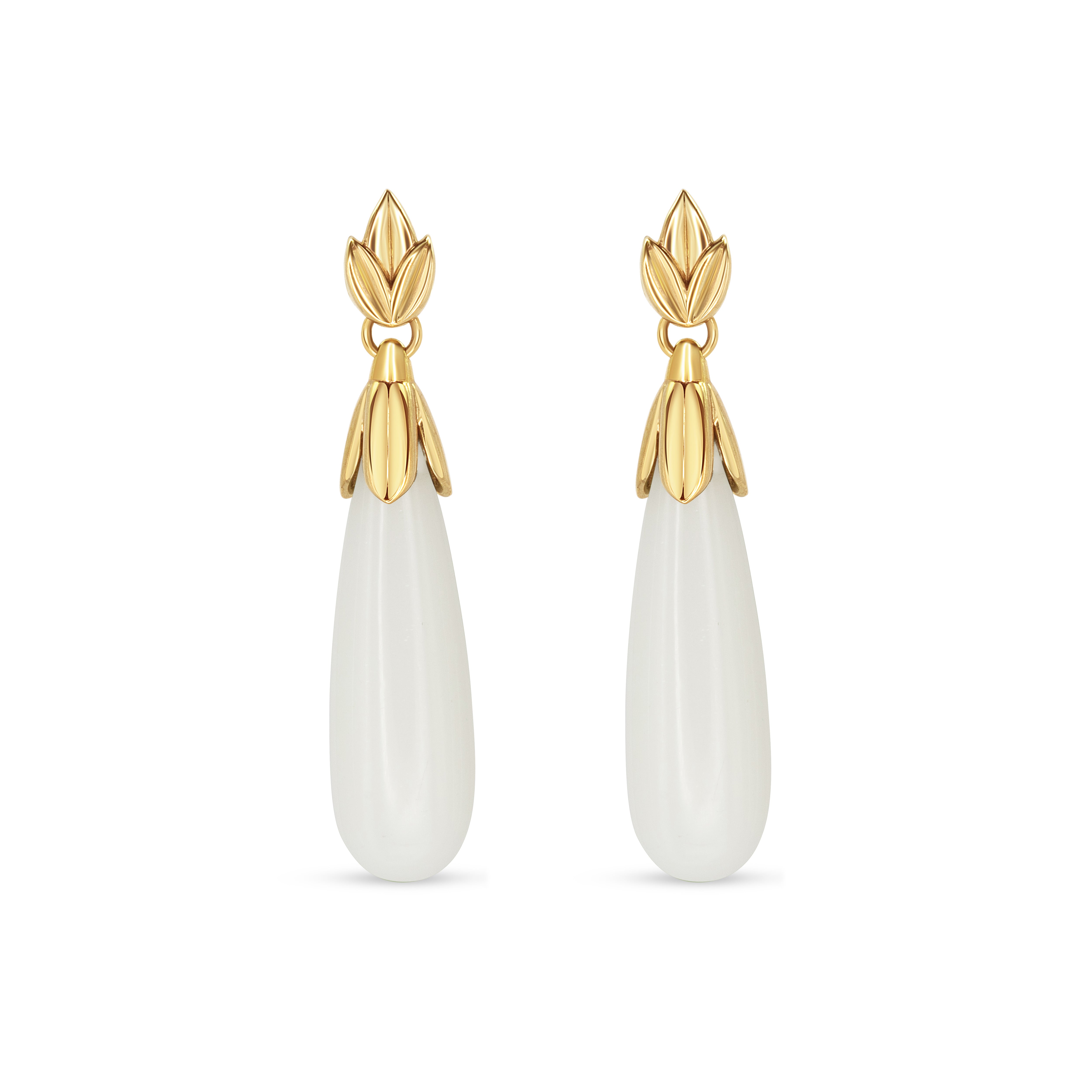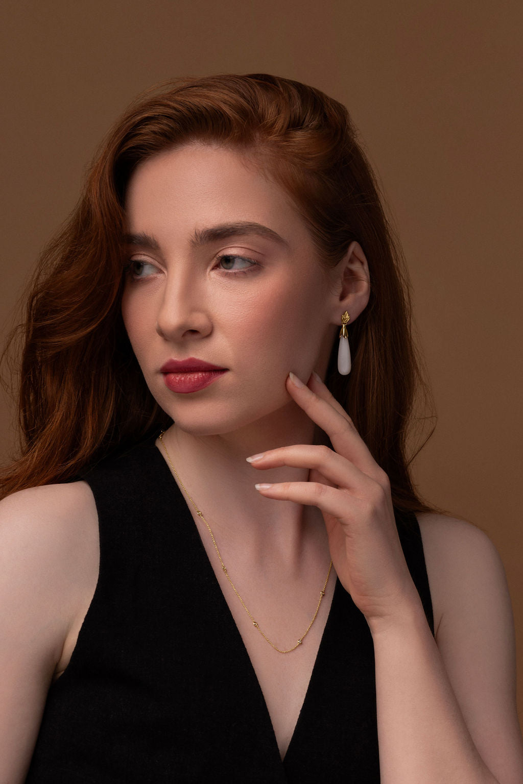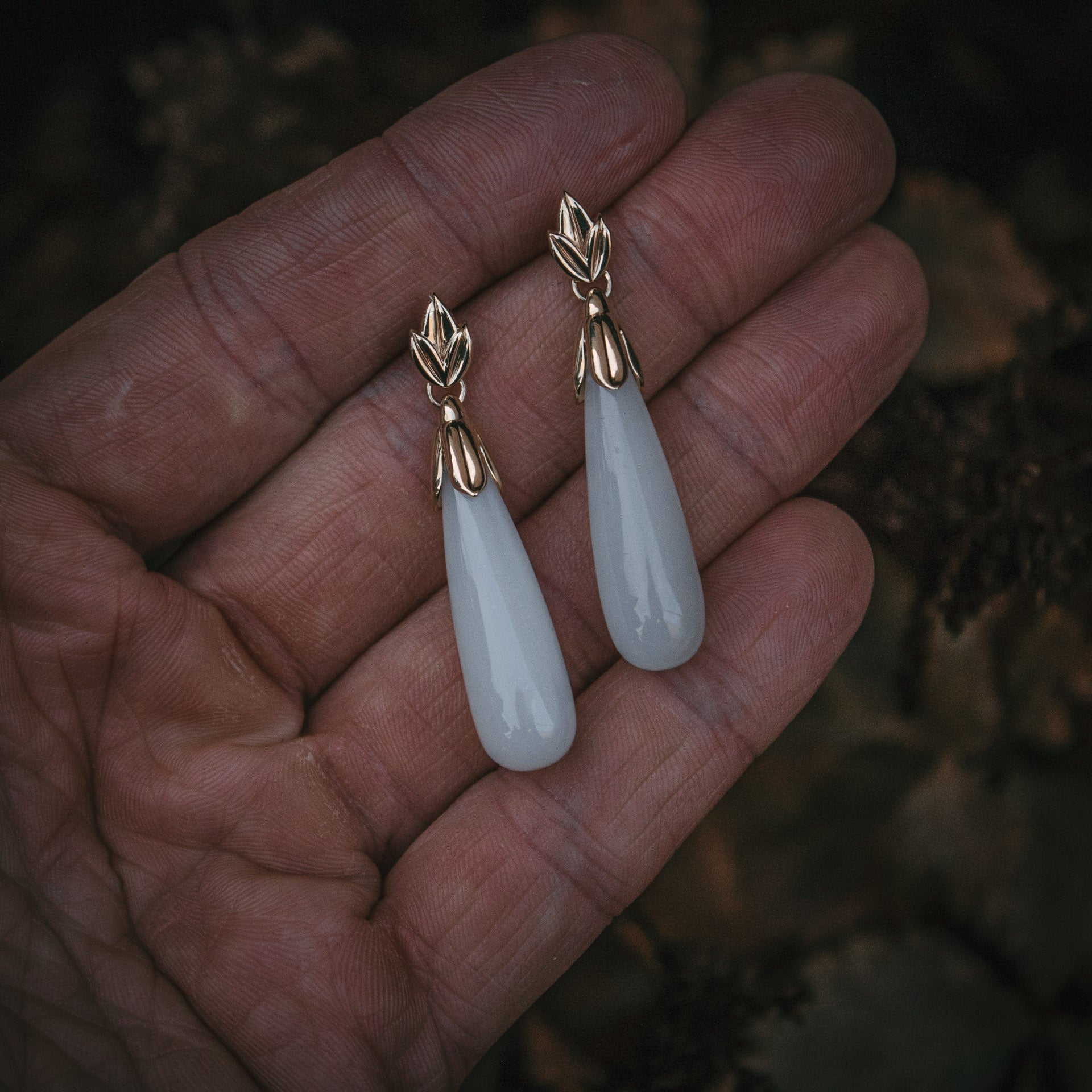A pair of moonstone drop earrings with snowdrop detailing. Each earring is set with natural moonstone drops set in 9ct yellow gold