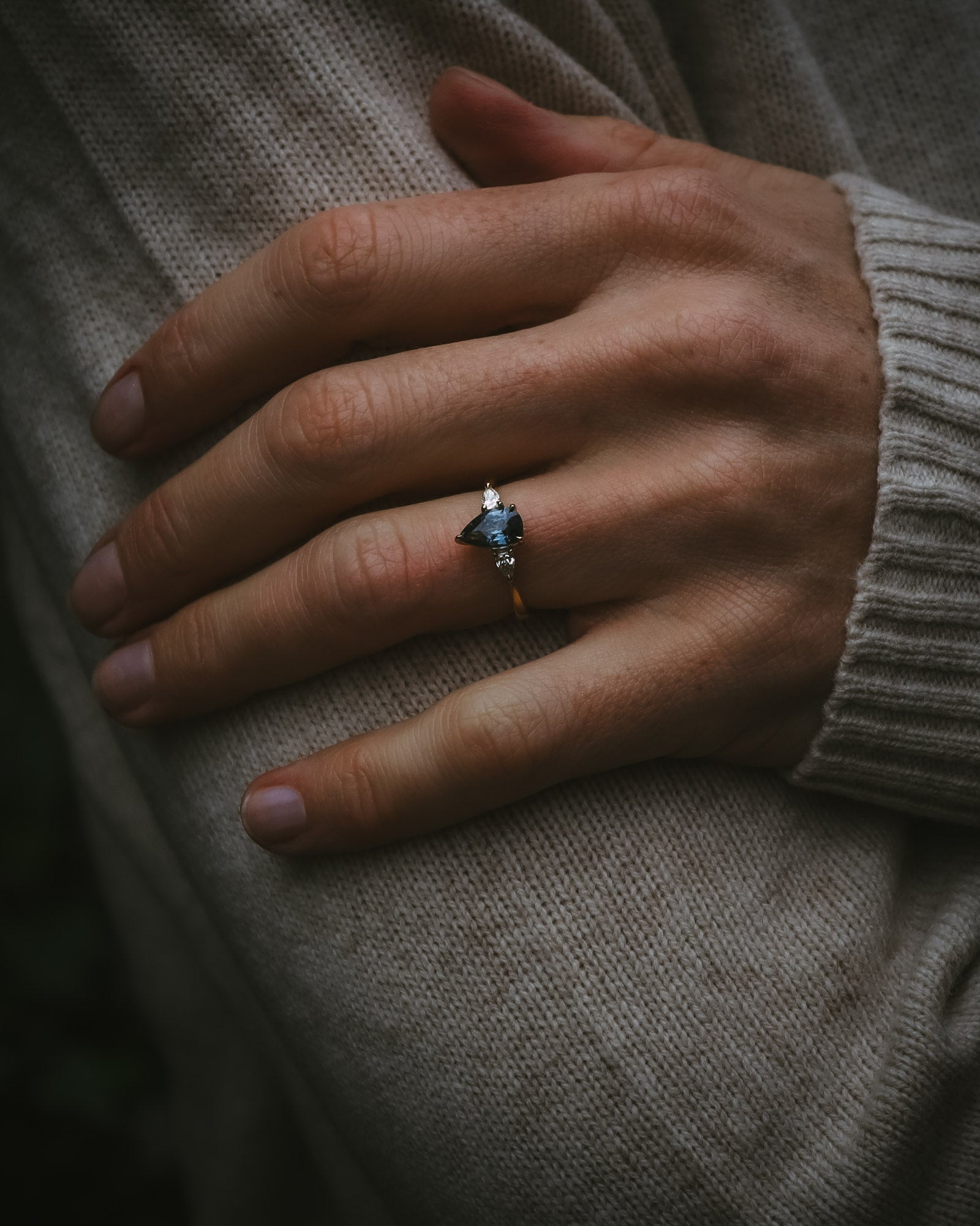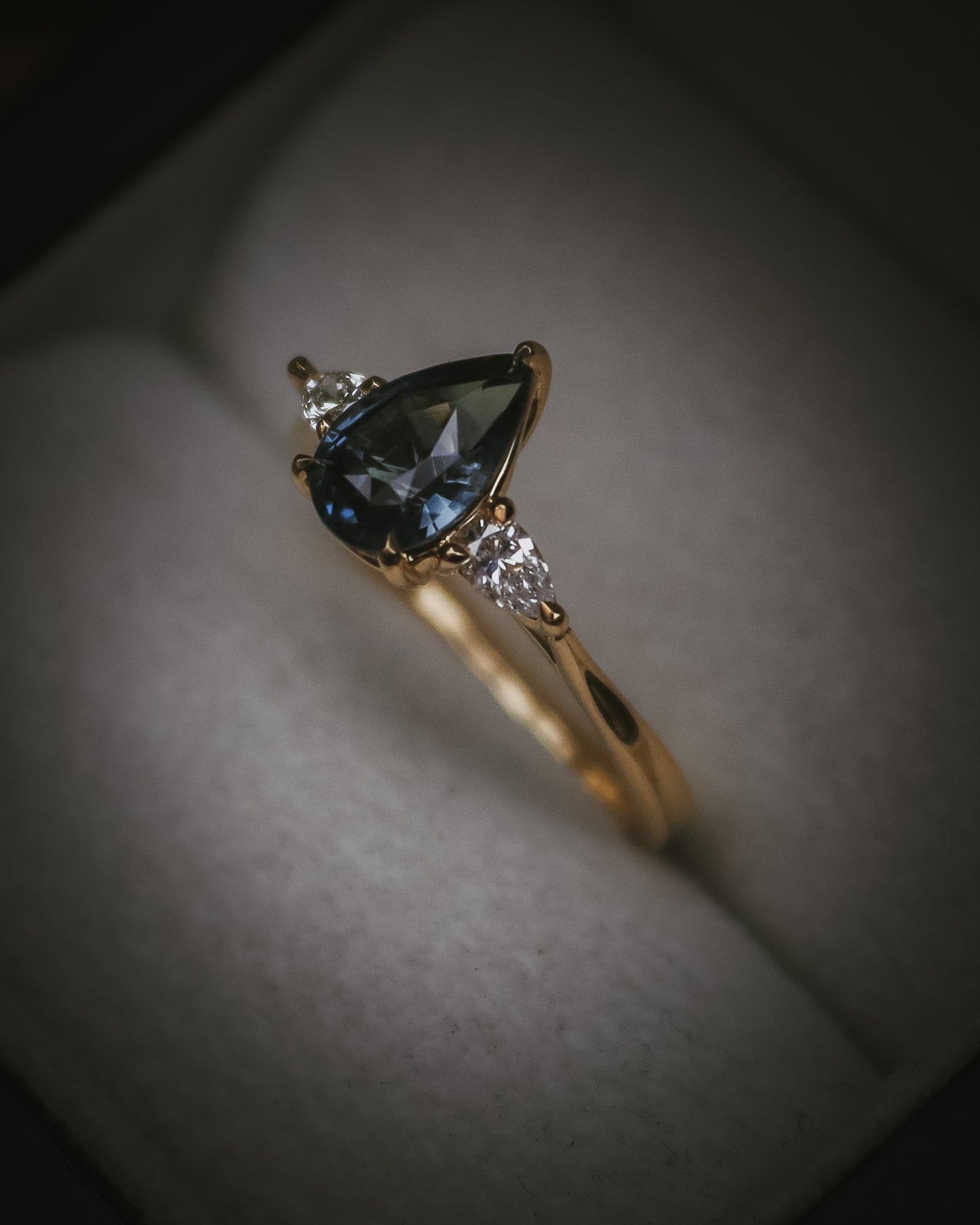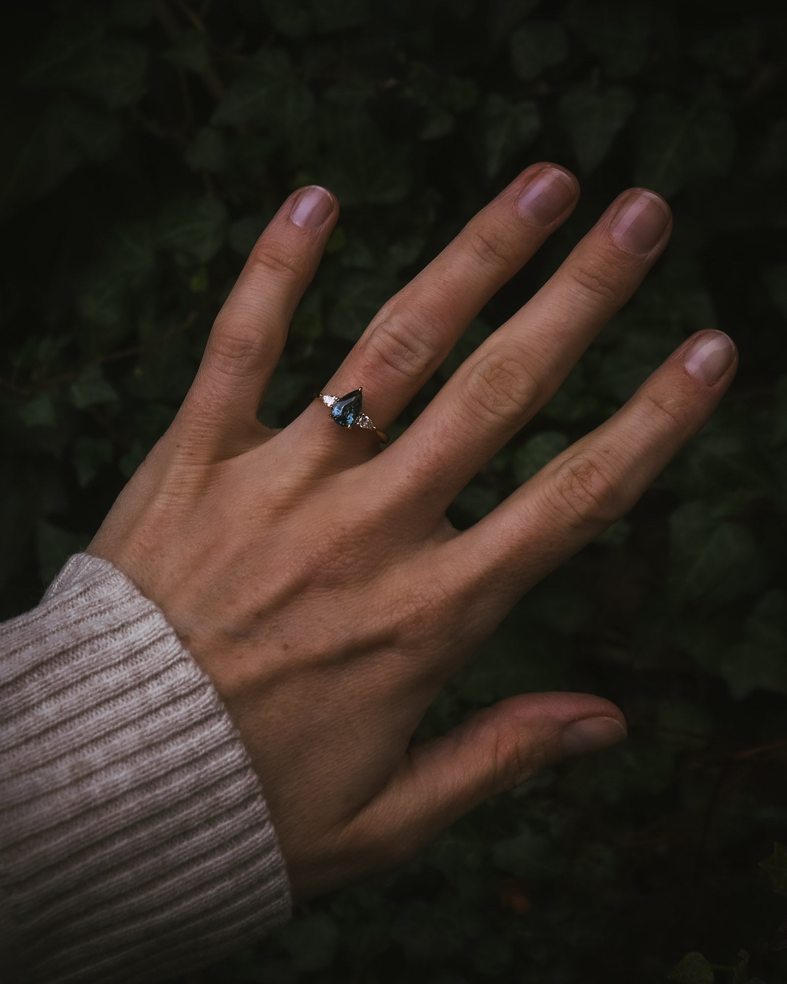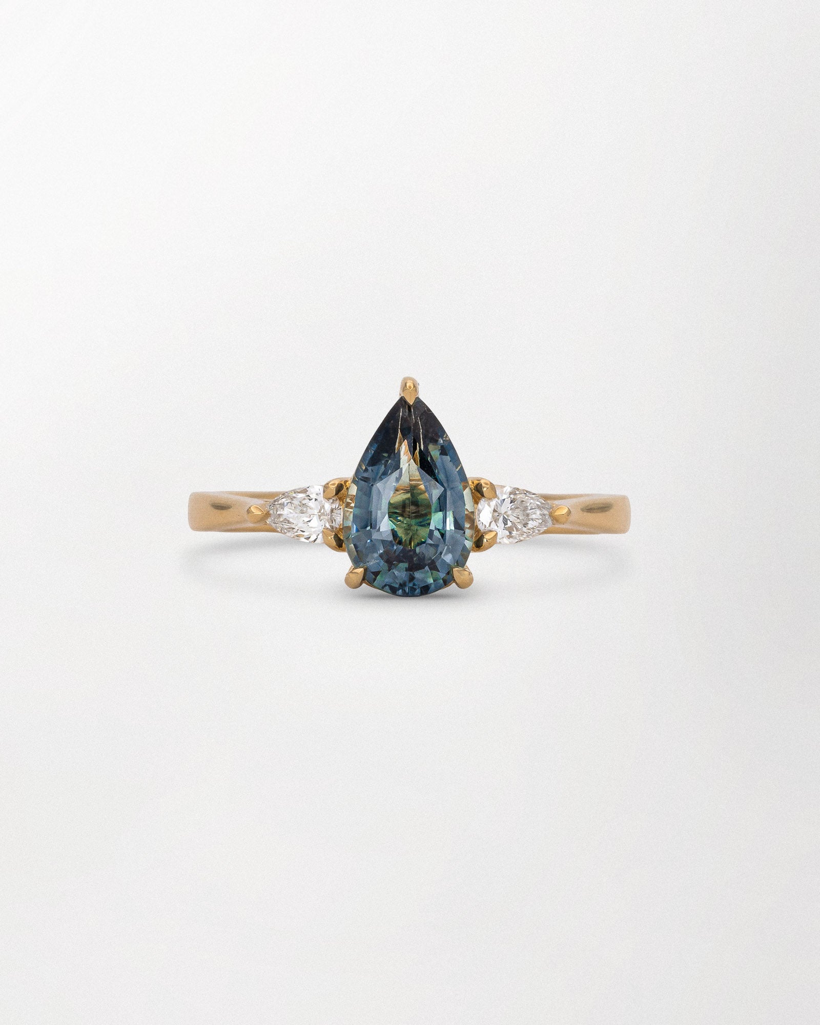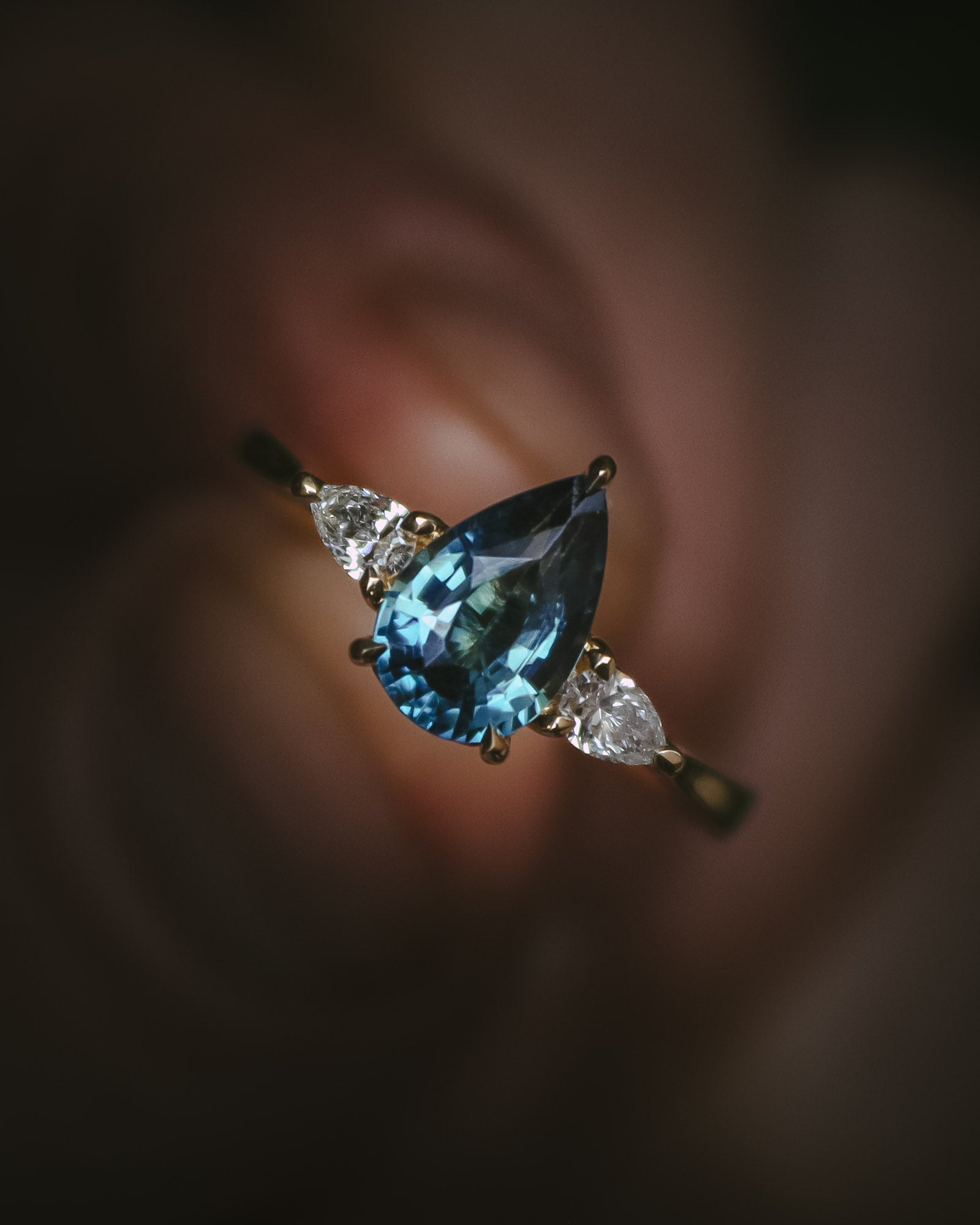 At the centre of the Peur ring sits a gorgeous pear-shaped teal sapphire with a rich blend of deep sea blue and soft green undertones. The elongated form draws the eye inward, with subtle shifts in colour and tone revealed as the stone moves in the light.