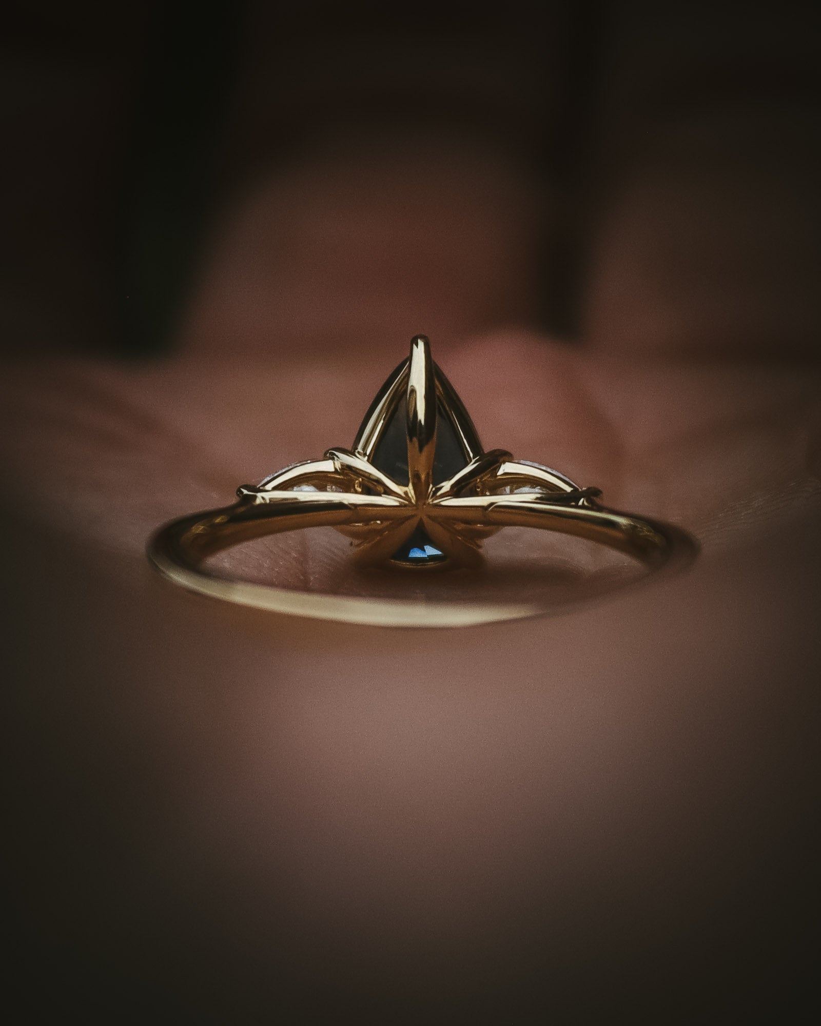 Pear-cut diamond accents echoe the silhouette of the centre stone creating a gentle sense of symmetry. Set in 18ct yellow gold and finished in Moira’s Arc setting, the stones are held within a sweeping, open structure that allows light to move freely beneath them.