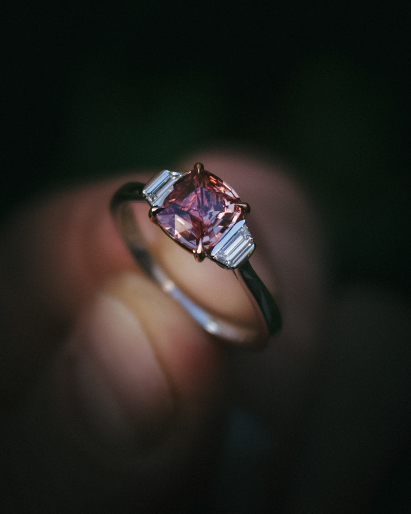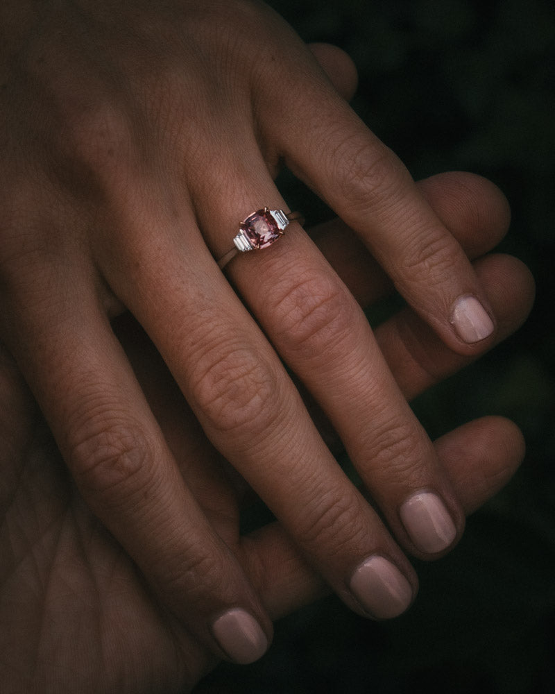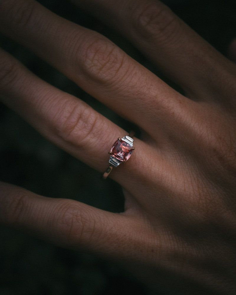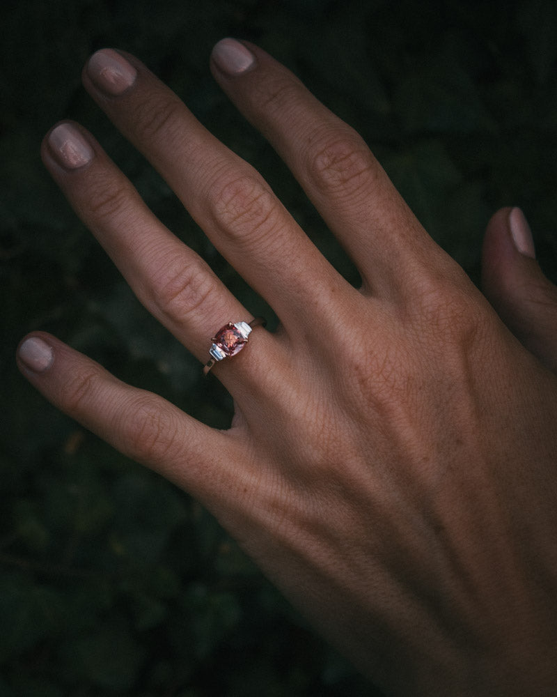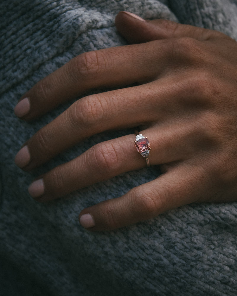 The Fyne ring showcases a natural padparadscha sapphire in a delicate balance of pink and orange hues. Its cushion cut glows softly from within, revealing a mesmerising blend of warmth and light that feels both rare and serene.