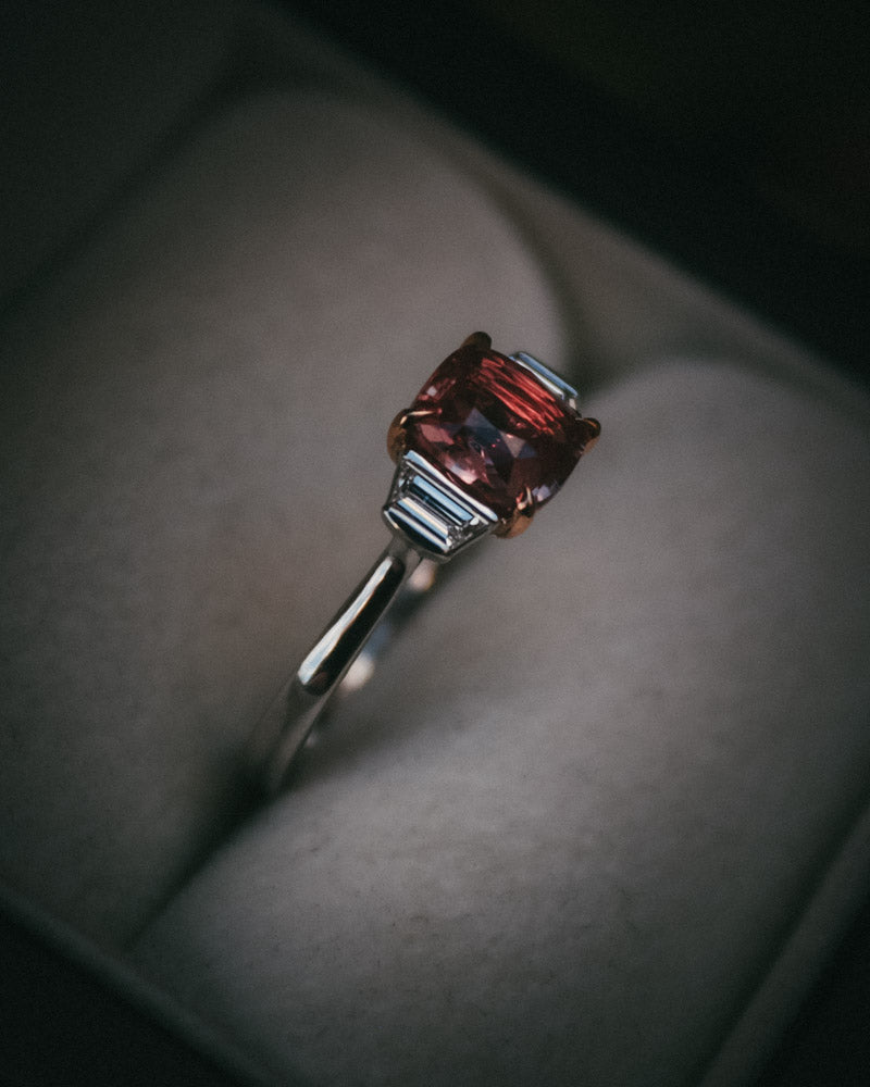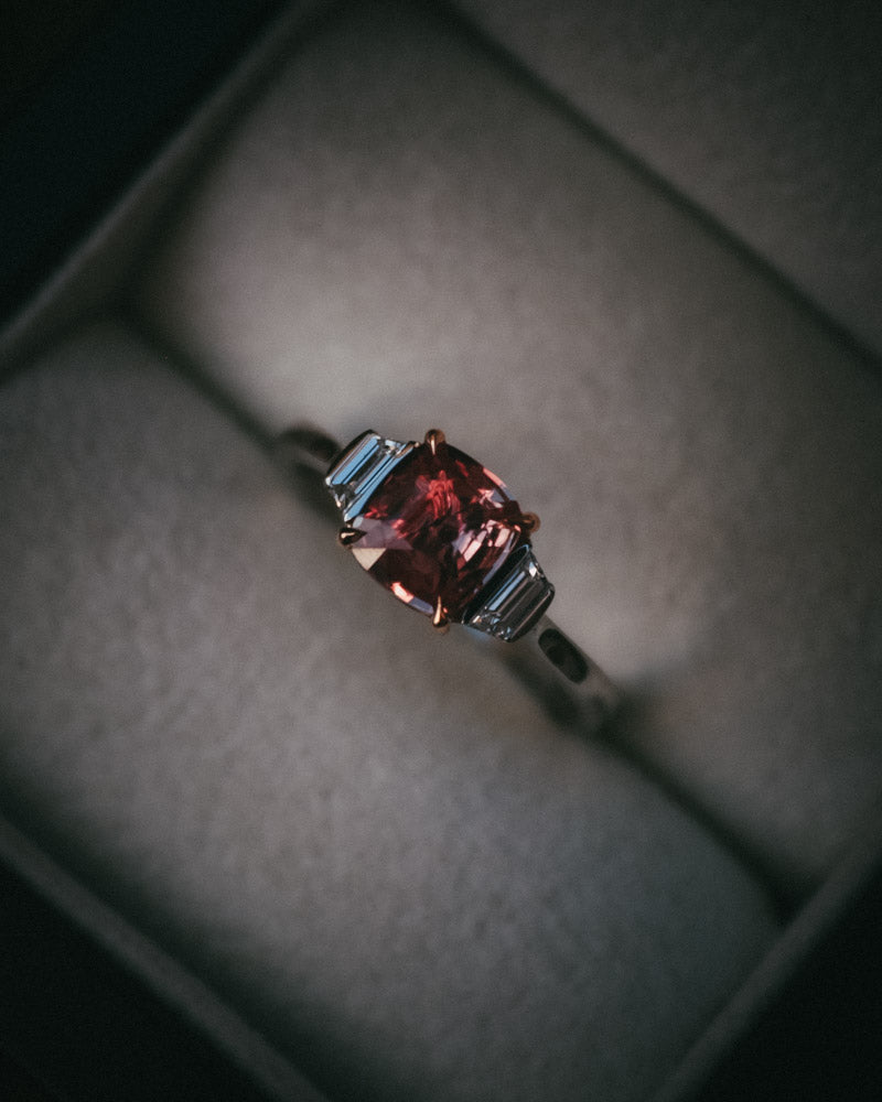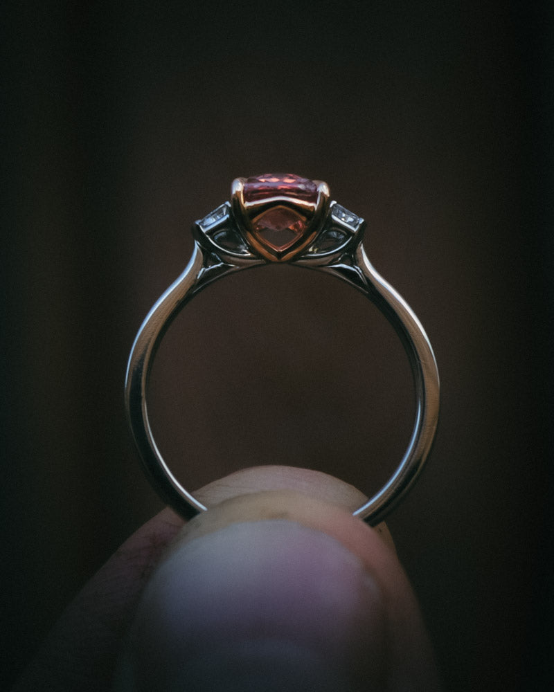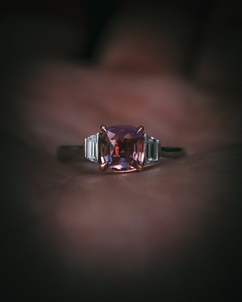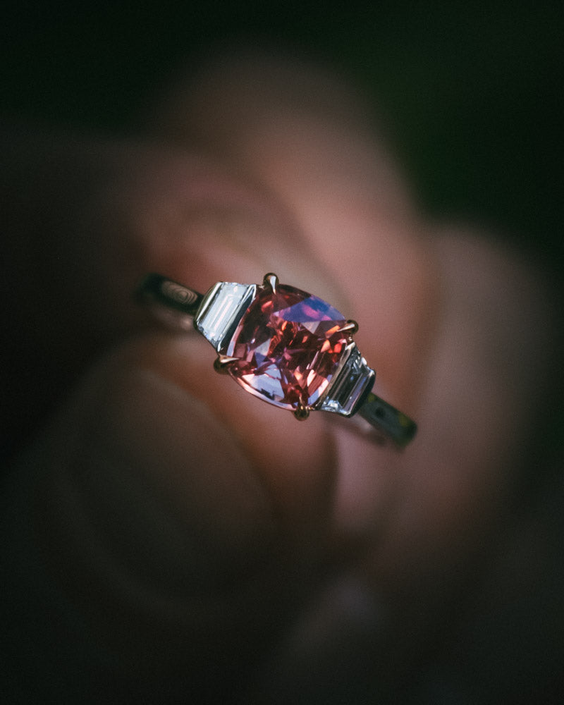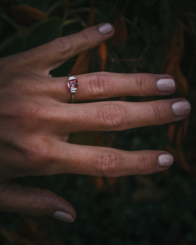 The Fyne ring showcases a natural padparadscha sapphire in a delicate balance of pink and orange hues. Its cushion cut glows softly from within, revealing a mesmerising blend of warmth and light that feels both rare and serene.