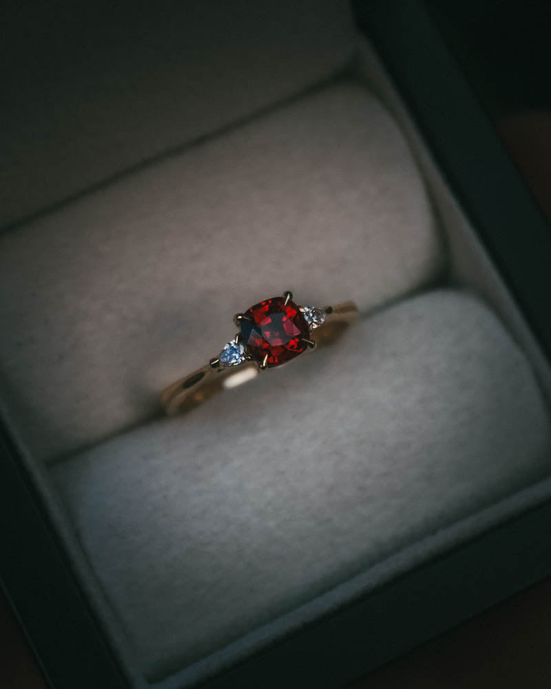 The Ledi ring features a vivid red spinel with a deep, velvety glow that shifts gently with the light. Its cushion cut enhances the natural richness of the stone, giving it a luminous, almost inner fire that draws the eye from every angle.
