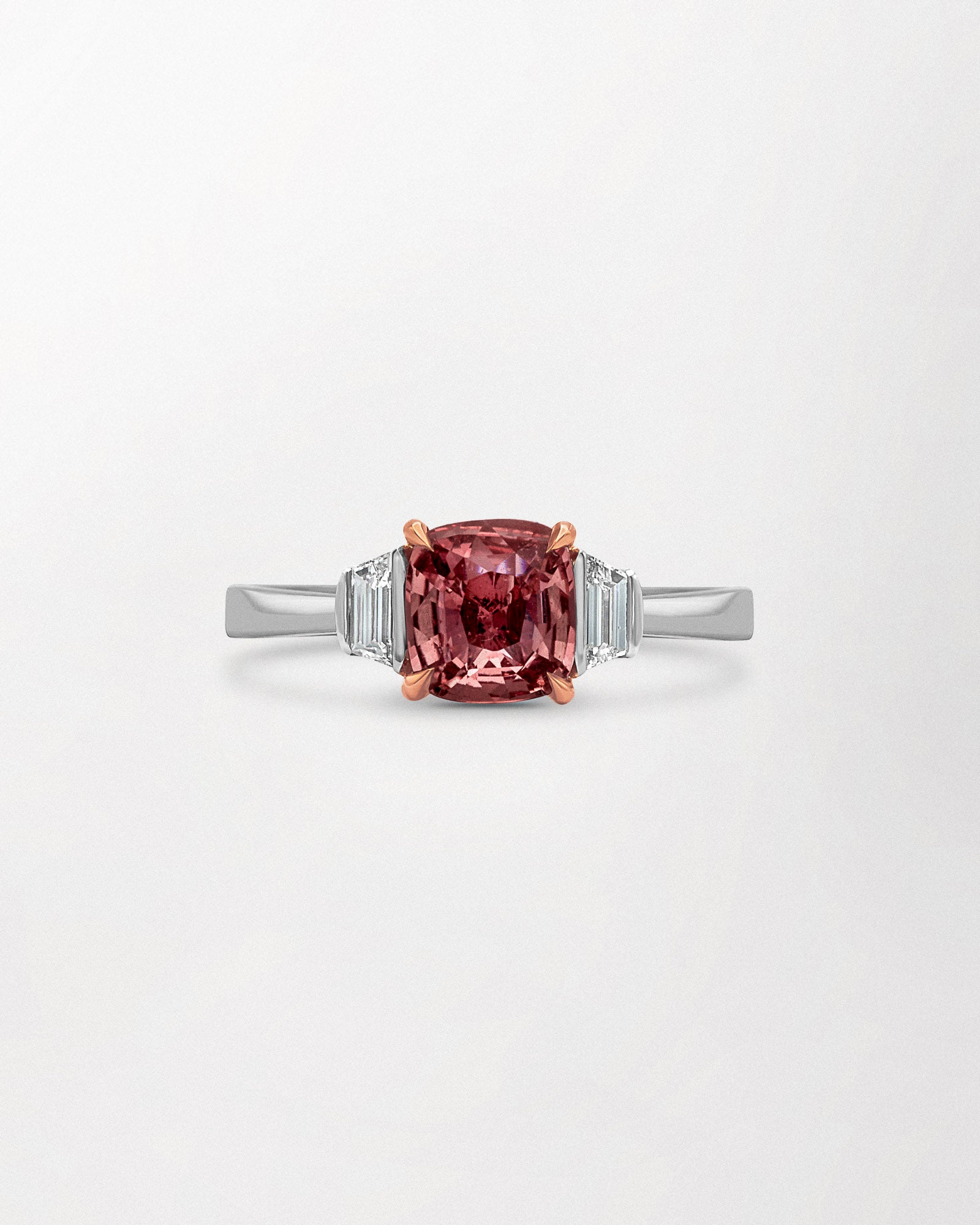 Trapezoid-cut diamonds on each shoulder frame the sapphire with precision and symmetry, enhancing its natural radiance. Crafted in platinum with an 18ct rose gold setting, the design reflects Moira’s signature Arc style; elegant, architectural, and timeless.
