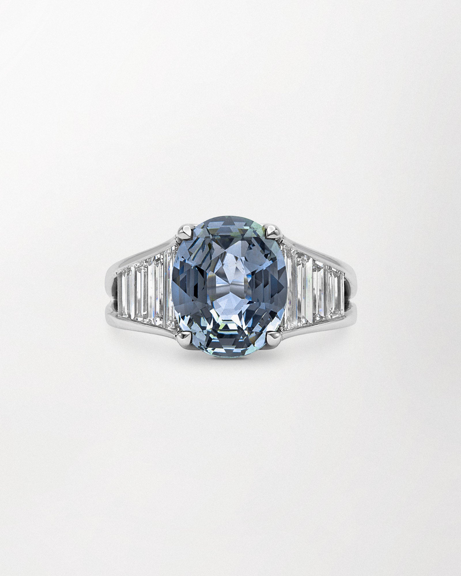 On either side, calibrated trapezoid diamonds form a seamless wall of sparkle; a crisp contrast to the organic oval-shape of the sapphire. Set in platinum and finished with Moira’s signature petal detailing under the setting, this one-of-a-kind creation balances light, strength, and timeless elegance in equal measure.